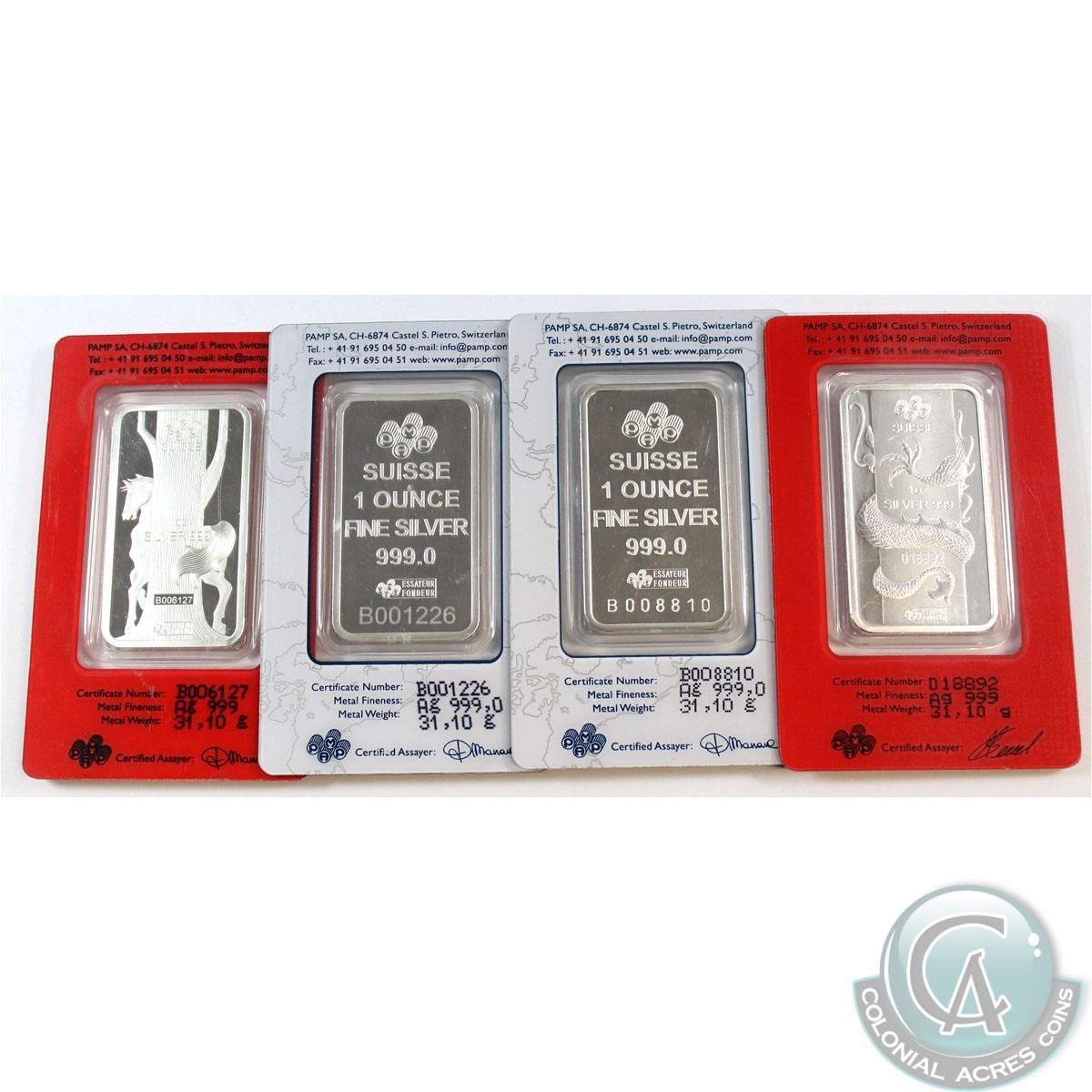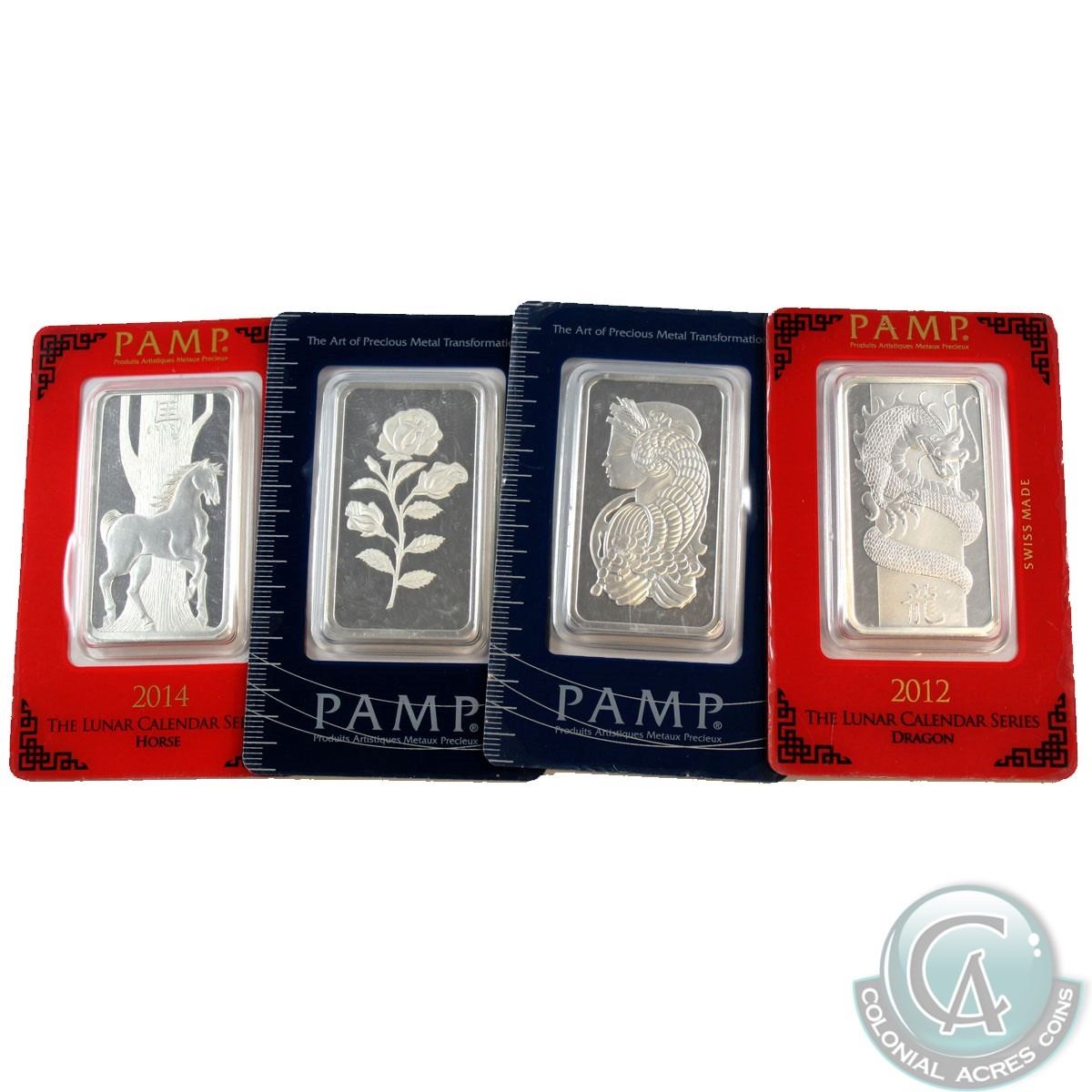 PAMP 1oz Fine Silver Bar Lot sealed in original Certificates (Tax Exempt). You will receive 4 different designs. 4pcs.