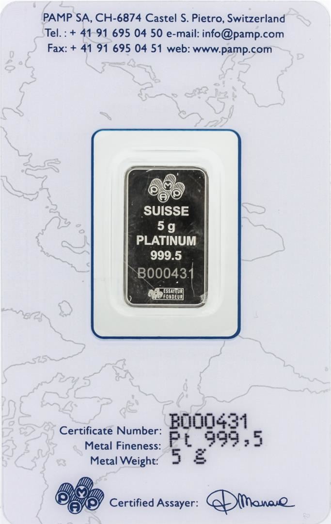 One PAMP Suisse .9995 Fine 5 Gram Platinum Bullion Bar. It was made in Switzerland and is certified with certificate number of B000431. It is in its original sealed case and in mint condition. Produits Artistiques Metaux Pr.