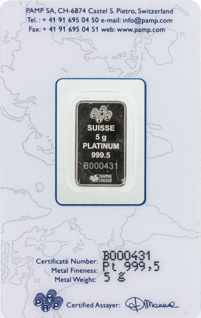 One PAMP Suisse .9995 Fine 5 Gram Platinum Bullion Bar. It was made in Switzerland and is certified with certificate number of B000431. It is in its original sealed case and in mint condition. PAMP Appraised.