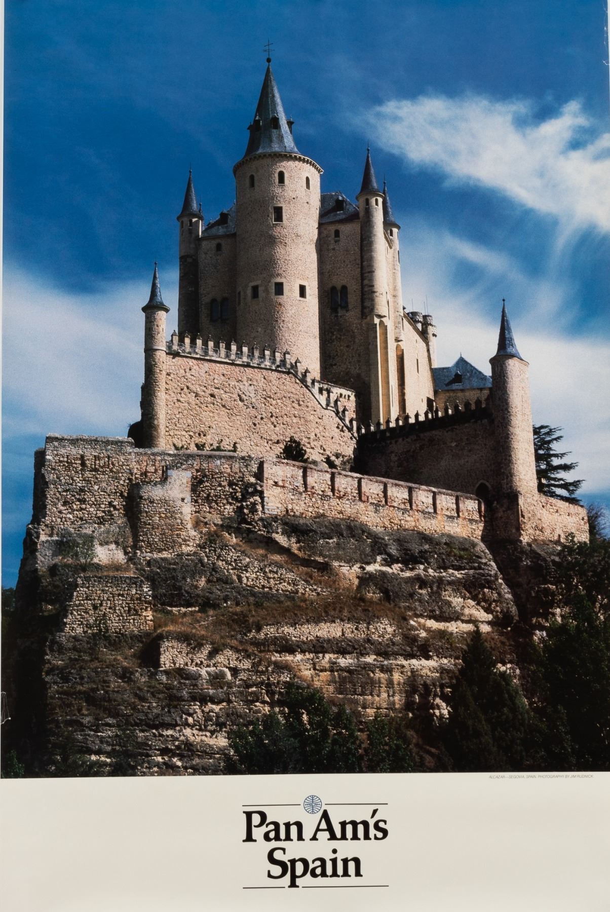 Pan Am travel poster, a photograph of the Alcazar de Segovia 'Pan Am's Spain', photographed by Jim Rudnick, 1985, 42 x 28 inches. Minor tears at left and right margins, else very good.
