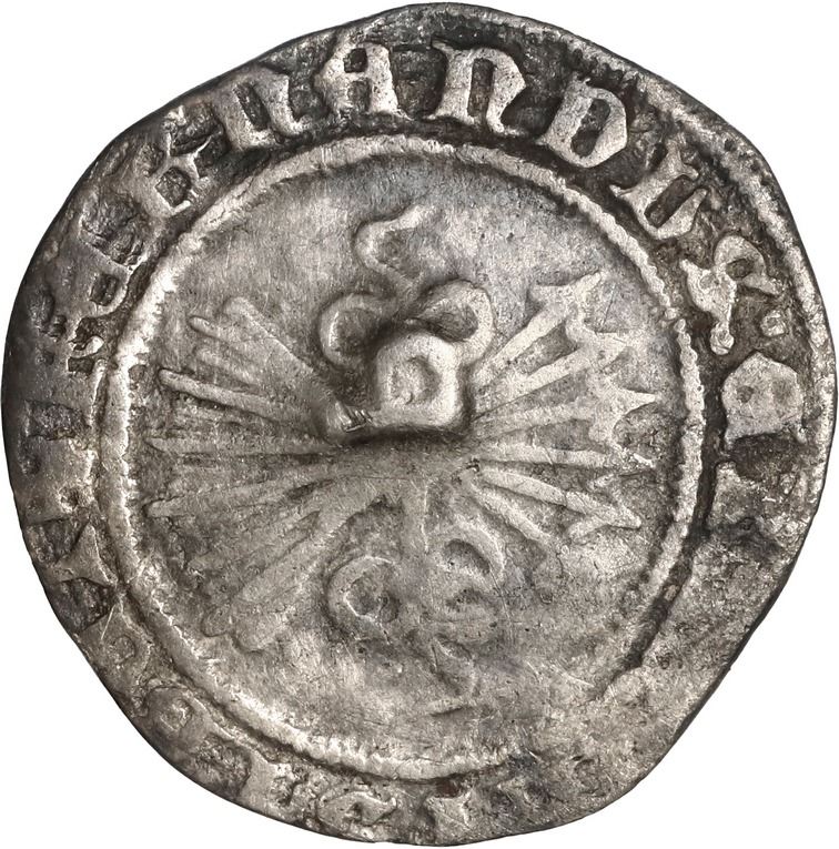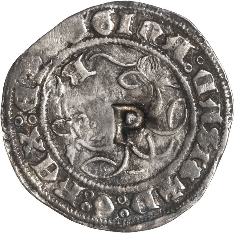 PANAMA, 1 real, incuse "P" countermark on a Burgos, Spain, ½ real, Ferdinand-Isabel, assayer scallop in legend, mintmark B below yoke, very rare. Host: López de la Fuente-E1.2.1.2; Cal-185. 1.61 grams. Bold full countermark (XF) in center of obverse of VF/Fine host with toning on fields, full legend (Gothic) on obverse and most on slightly off-center reverse, the latter with minor porosity.
