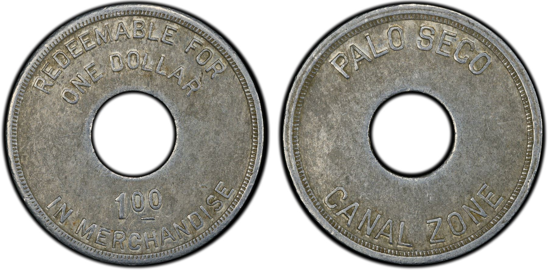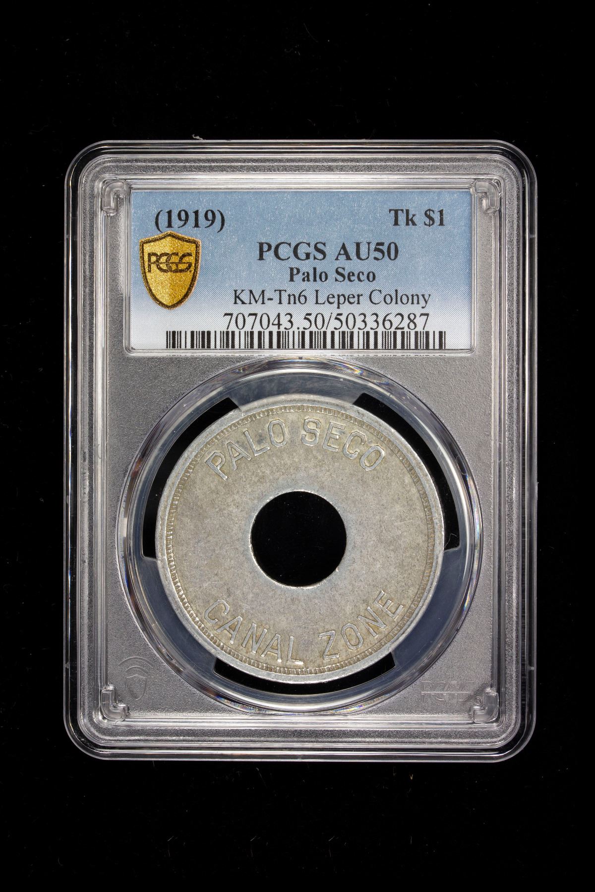 PANAMA: CANAL ZONE: U.S. Concession, 1 dollar, ND (1919), KM-Tn6, Palo Seco Leprosarium issue; PALO SECO / CANAL ZONE // REDEEMABLE FOR / ONE DOLLAR / IN MERCHANDISE, PCGS graded AU50, ex Dr. Robert A. Rosenfeld Collection. In 1907, the Palo Seco Leper Colony officially opened on the Canal Zone's rocky Pacific shore. In 1919, the administrators set up a system to compensate people according to their "efficiency" or "physical" ratings based on their disabilities. Levels A, B, C, and D earned 10, 8, 6, and 4 cents per hour, respectively, money the residents could use to buy small items for themselves. The money the residents were issued had limitations as well. Starting in 1919, Palo Seco had its own brass and aluminum coins, which are coveted among collectors today. These reinforced the administrators' patronizing attitude: unlike a system of ledgers, the simulated currency was supposed to make Palo Seco's residents feel more independent. The special tokens also quelled the public's fears about money being handled by people with Hansen's disease, and they were supposed to prevent the residents from buying rum or using their small savings to escape, either temporarily or permanently. The tokens, struck in 1919, served until 1952 and were largely destroyed in 1955 after demonetization.