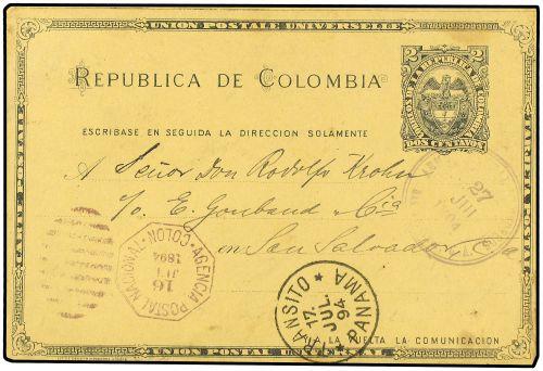 1894 COLON a S. SALVADOR. Entero Postal de 2 ctvos. con mat. duplex de AGENCIA POSTAL NACIONAL/COLON y TRANSITO/PANAMA.