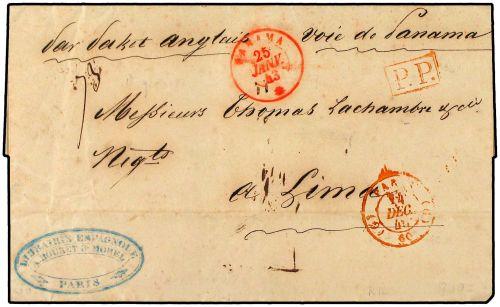 1843 FRANCIA a LIMA (Peru). Circulada por el correo inglés vía Panama donde fue recogida por el correo francés que le estampó la marca ConsularPANAMA/*. MAGNIFICA Y MUY RARA.