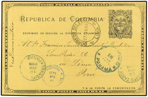 1893 MEDELLIN a LIMA (Peru). Entero Postal de 2 ctvos. fechador TRANSITO TARDE/PANAMA en azul.