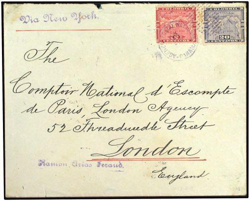1902 PANAMA a LONDRES. 2 ctvos. rojo y 20 ctvos. lila. Muy rara combinación de franqueo con un sobreporte de 2 ctvos. probablemente para el pago de la tarifa de ´Retardo´ (Sc. 16,19).