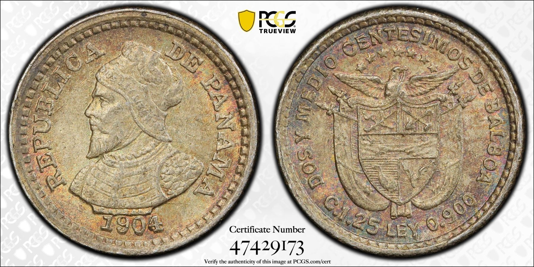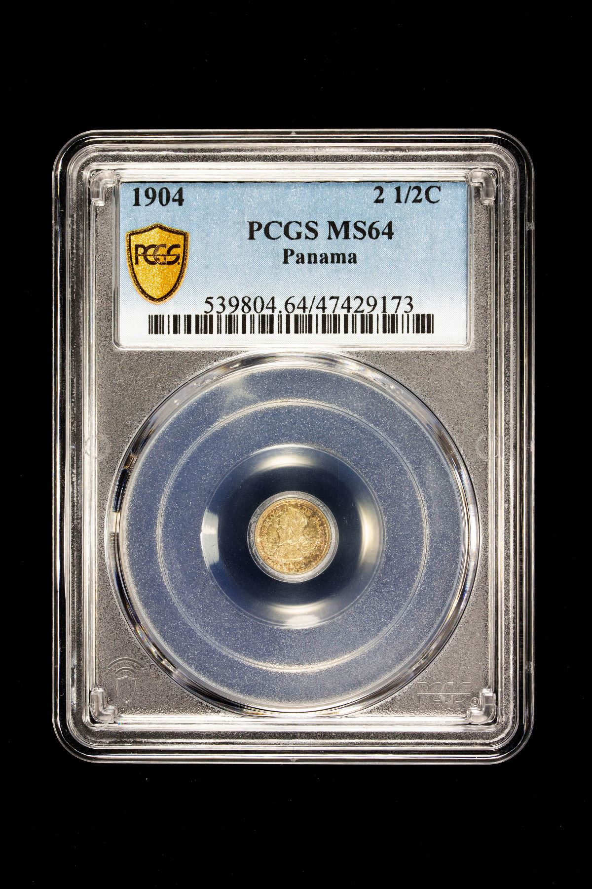 PANAMA: Republic, AR 2½ centesimos, 1904, KM-1, one-year type struck at the Philadelphia Mint, lustrous with muted iridescent toning, PCGS graded MS64. This coin is the smallest ever minted in the USA, thus its nickname "Panama pill". It was needed to make the 12.5 cents = 1 real of the former Hispano-American monetary system, when added to a 10 cents coin.