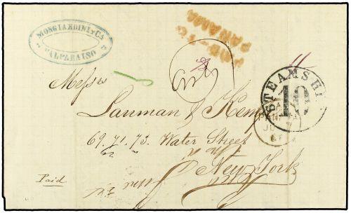 1867 VALPARAISO a NEW YORK. Fechador de la B.P.O. de GUAYAQUIL y en el frente PAID-TO/PANAMA.