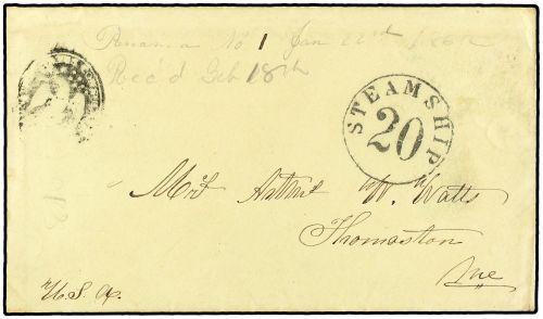 1862 PANAMA a U.S.A. Marca en negativo del Consulado US. en Panamá, estampación poco clara, tasada a la llegada con 20 cents.