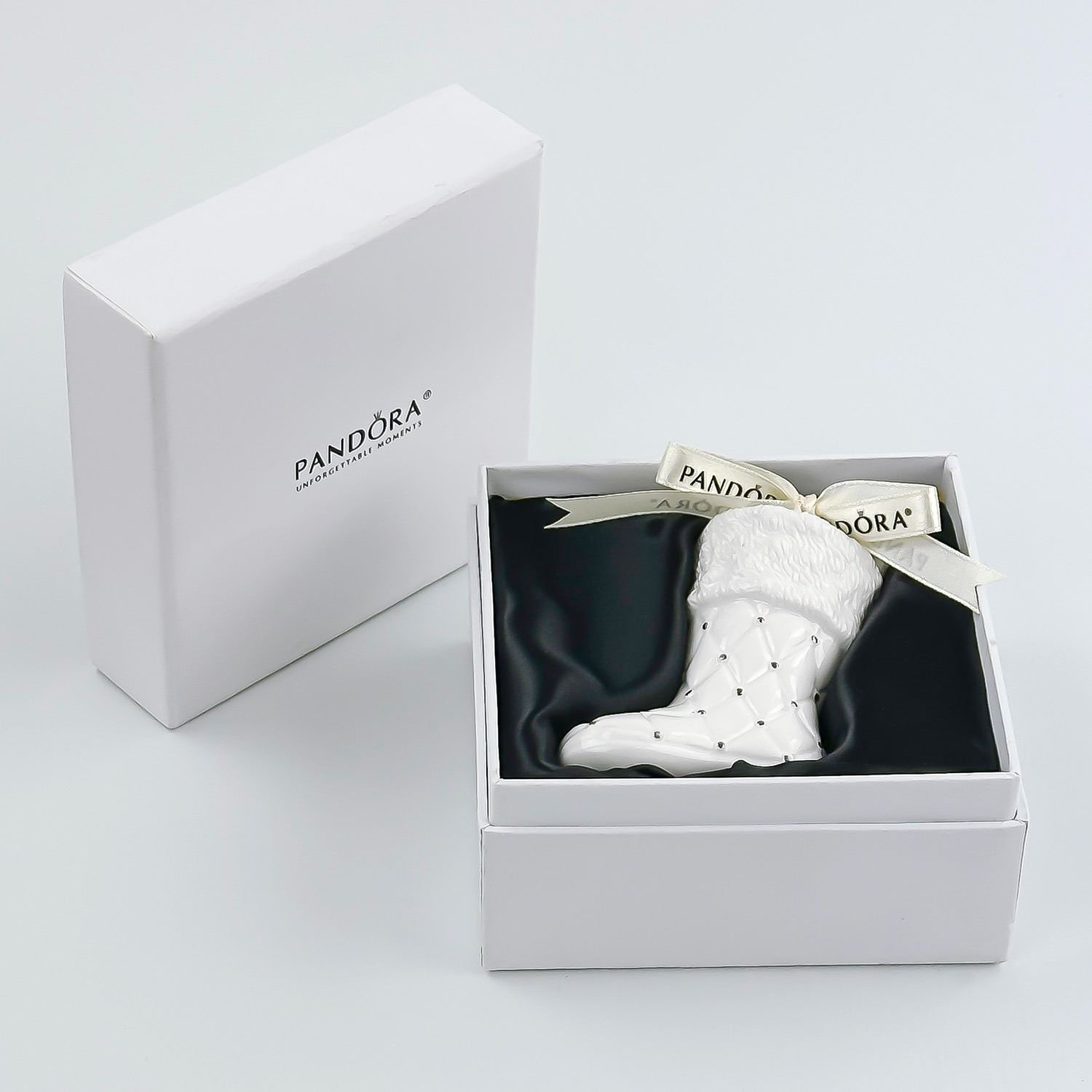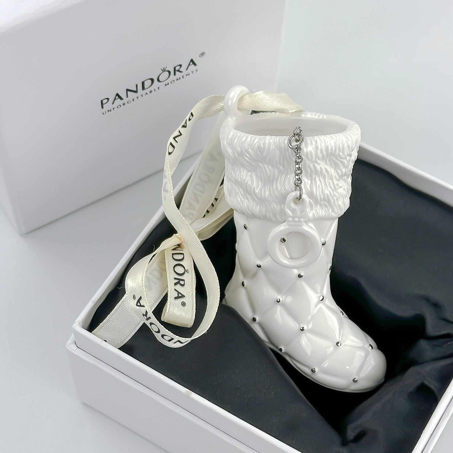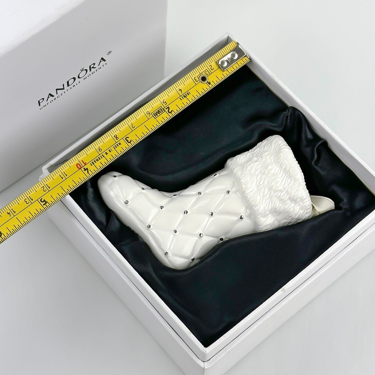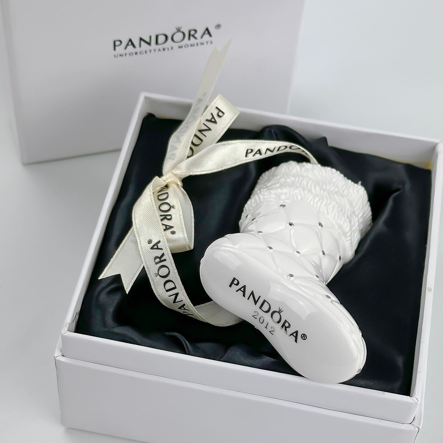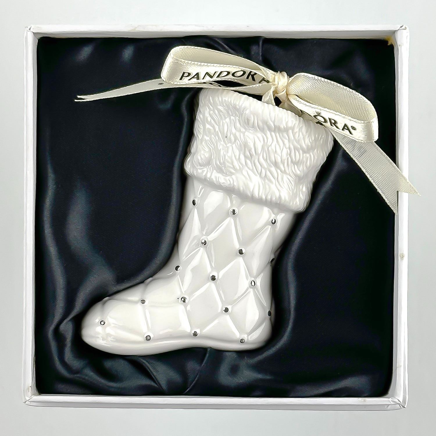 #8103 - LIMITED EDITION PANDORA 2012 PORCELAIN CHRISTMAS STOCKING TREE ORNAMENT - WHITE & SILVER BOOT IN ORIGINAL BOX. HOME XMAS DECOR. MEASURES: 3.5” (9 CM) LONG