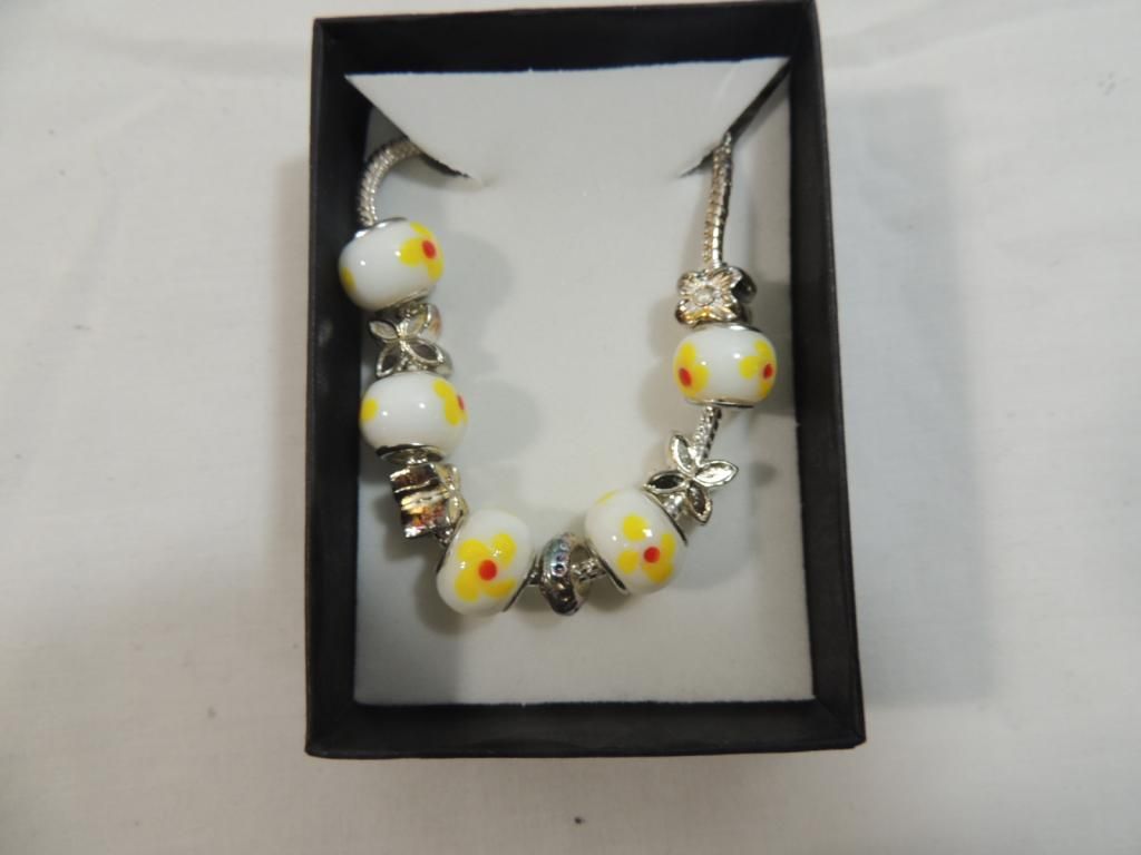 PANDORA METAL AND BEAD BRACELET GLASS BEADS WHITE BEAD WITH YELLOW AND RED FLOWER DETAIL. SILVERTONE FLOWER BEAD. AS SHOWN SEE PHOTO FOR MORE DETAILS.