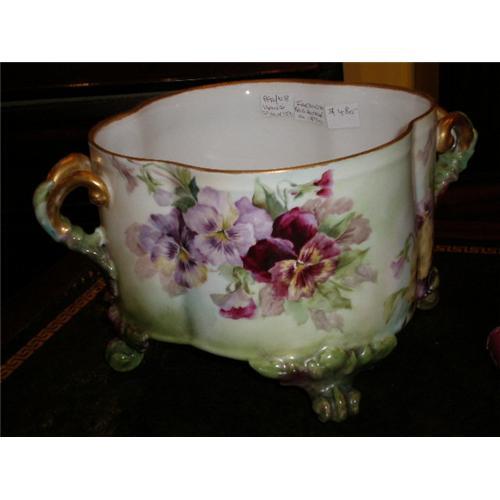 A BEAUTIFULLY HAND DECORATED PORCELAIN TWO HANDLED JARDINERE WITH BRIGHTLY COLORED PANSIES. THIS IS A NICELY SHAPED JARDINERE WITH EXCELLENT GILDING TO BOTH THE TOP EDGE AND THE OPEN WORK HANDLES. MADE IN GERMANY BUT UNMARKED.