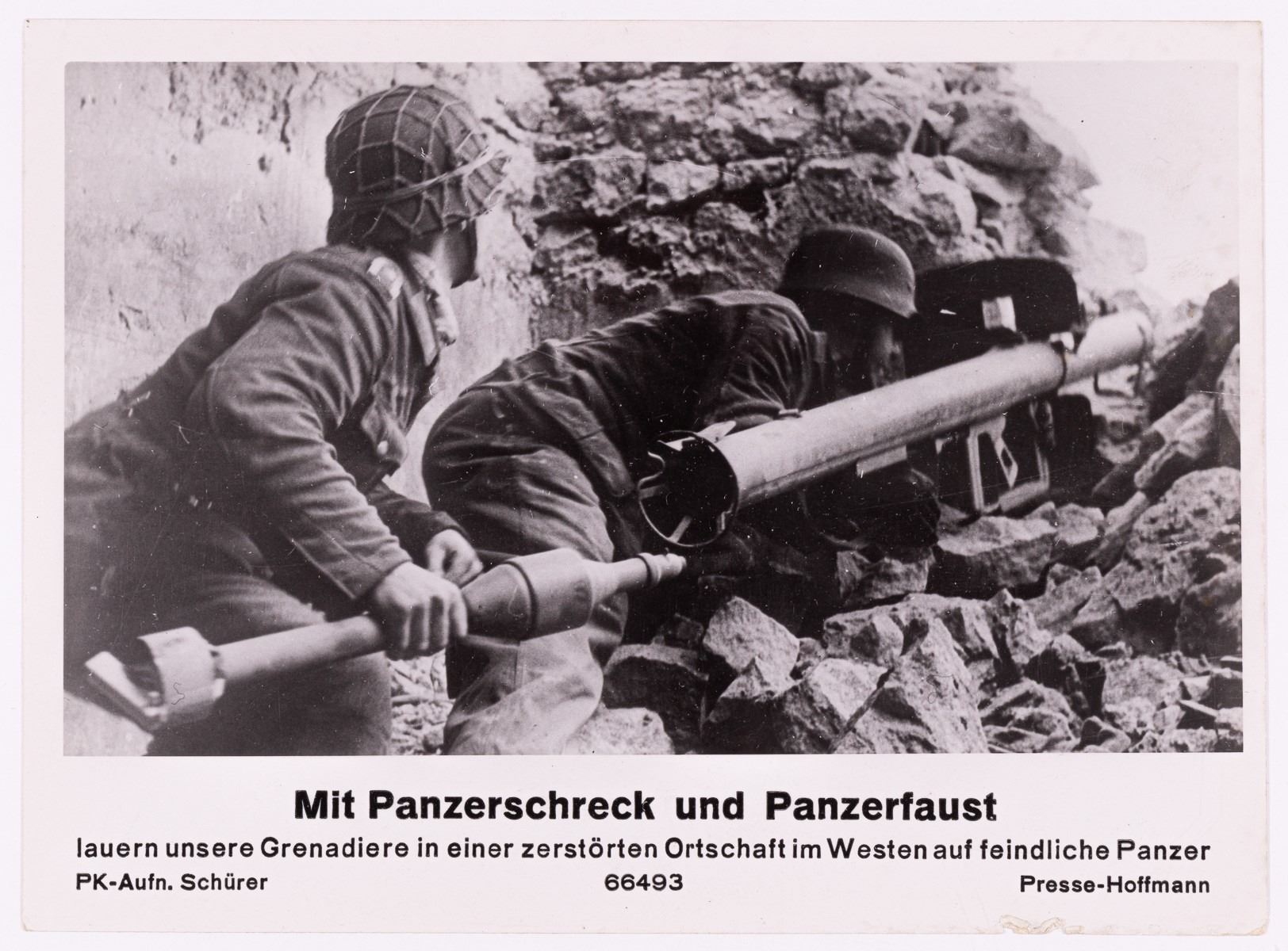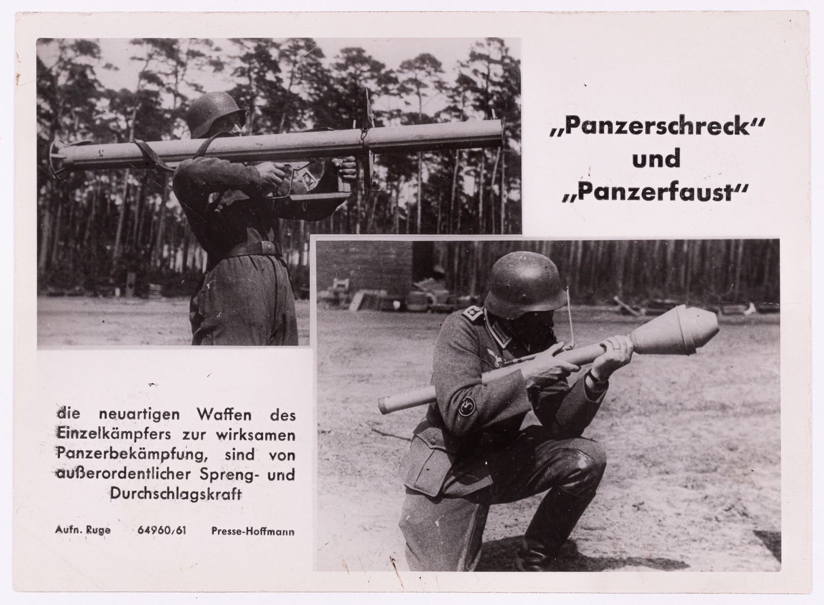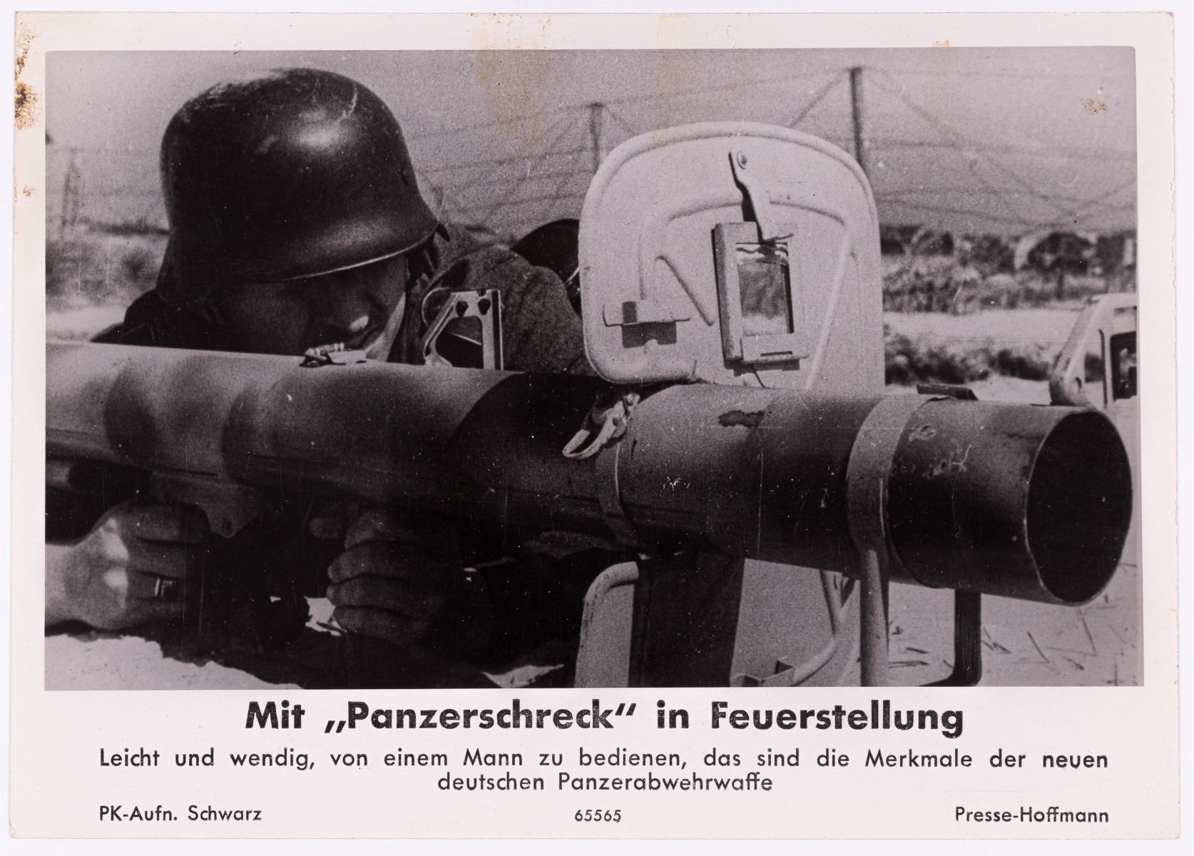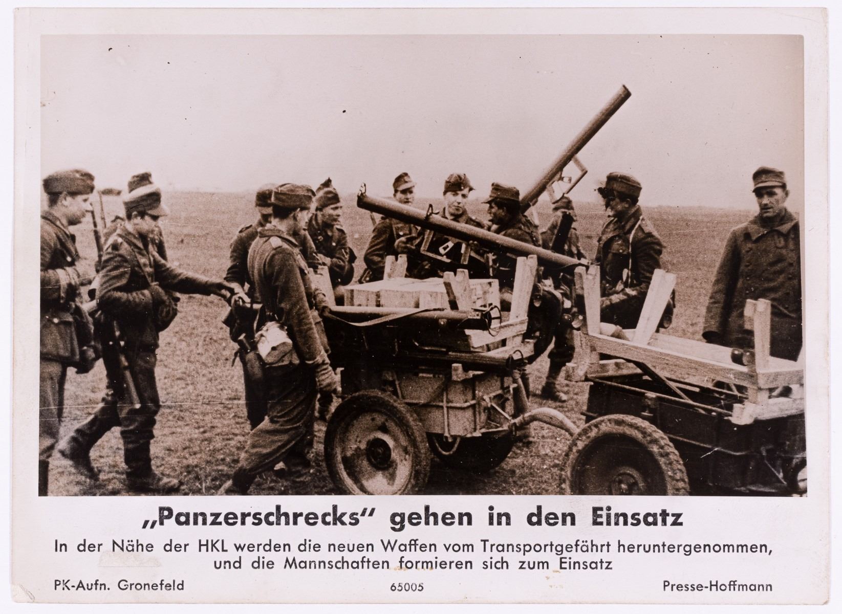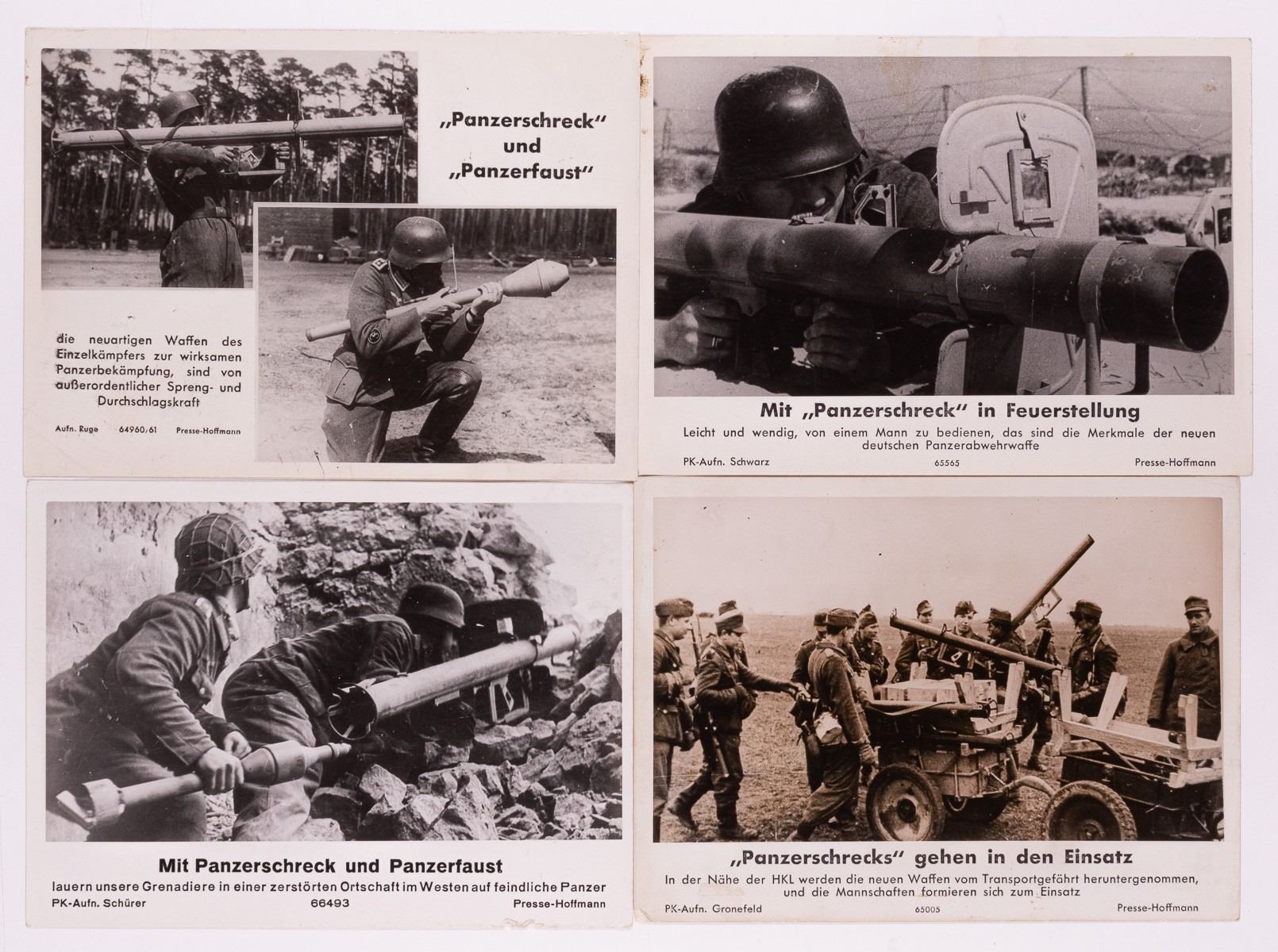 Four original black-and-white glossy Propagandakompanie photographs published by Heinrich Hoffmann. Photos show anti-tank guns and soldiers. 5 x 7 inches.