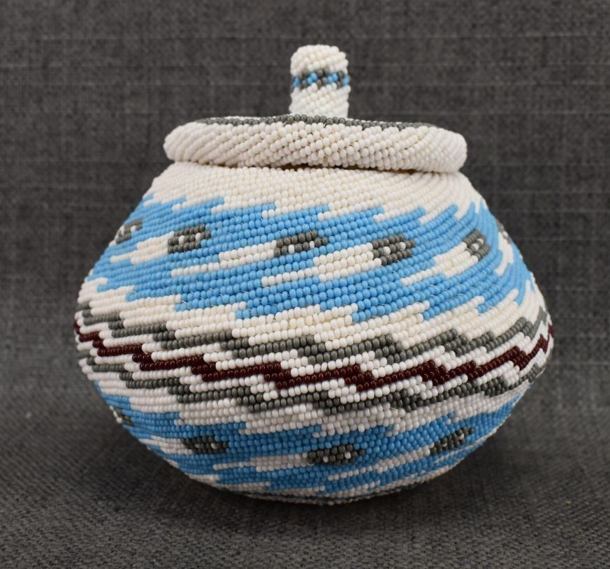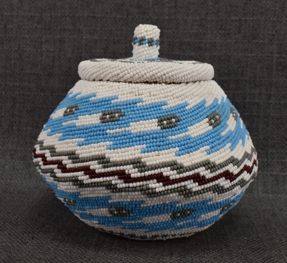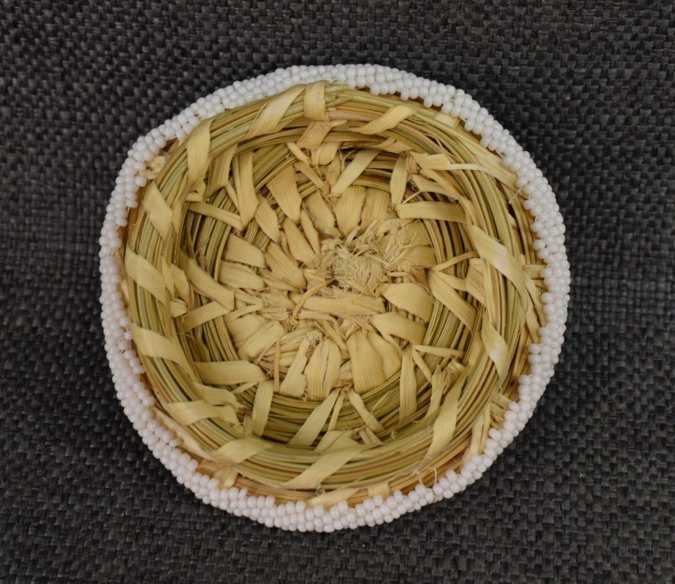 1970-80's Papago Indian hand woven basket with beaded feather and banded design 5" x 5.5"
