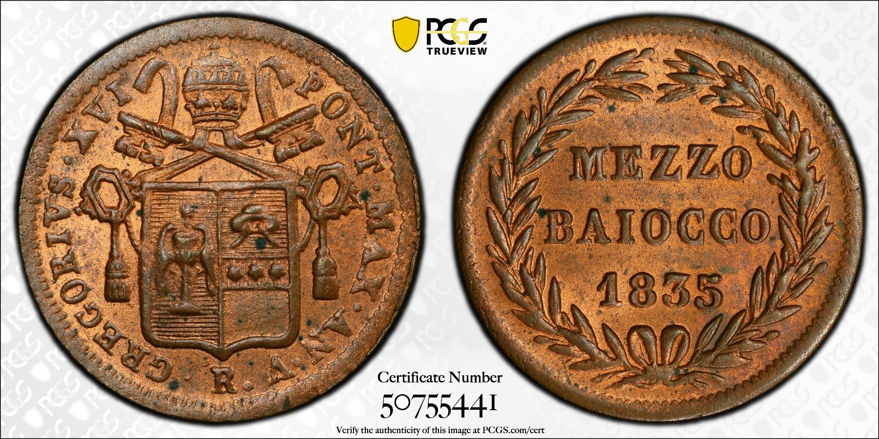 PAPAL STATES: Gregorius XVI, 1831-1846, AE 1/2 baiocco, 1831-R year V, PCGS MS64 RB
