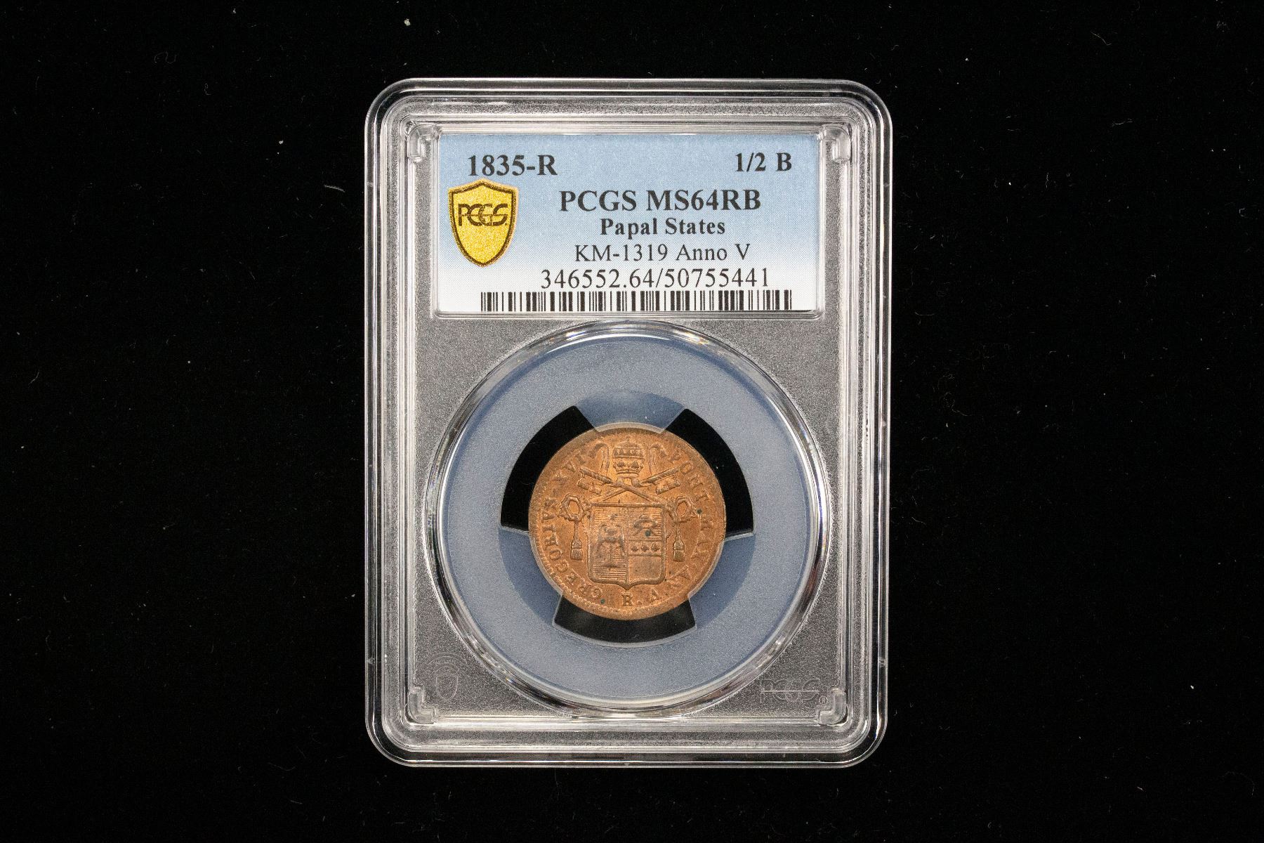 PAPAL STATES: Gregorius XVI, 1831-1846, AE 1/2 baiocco, 1831-R year V, KM-1319, a wonderful lustrous caramel red brown mint state example! PCGS graded MS64 RB.