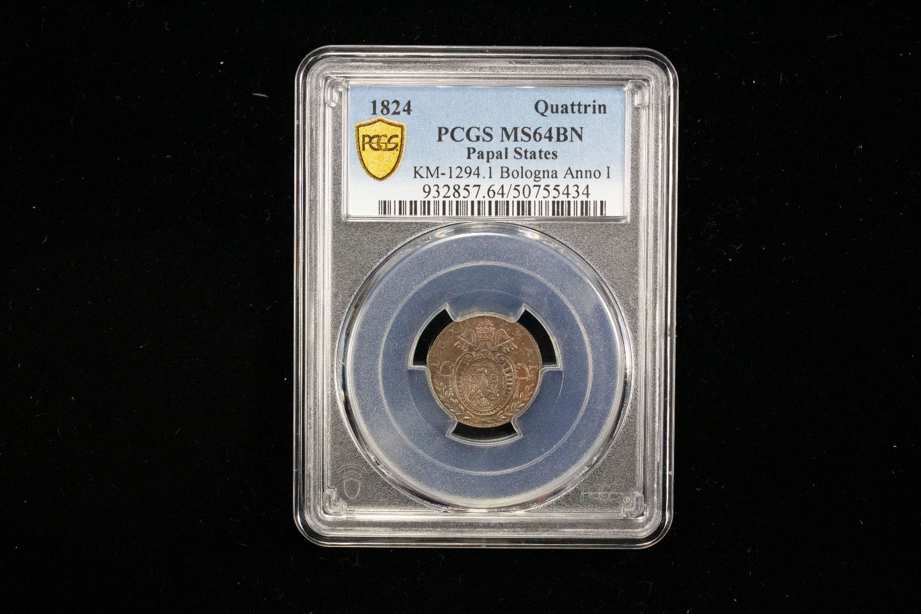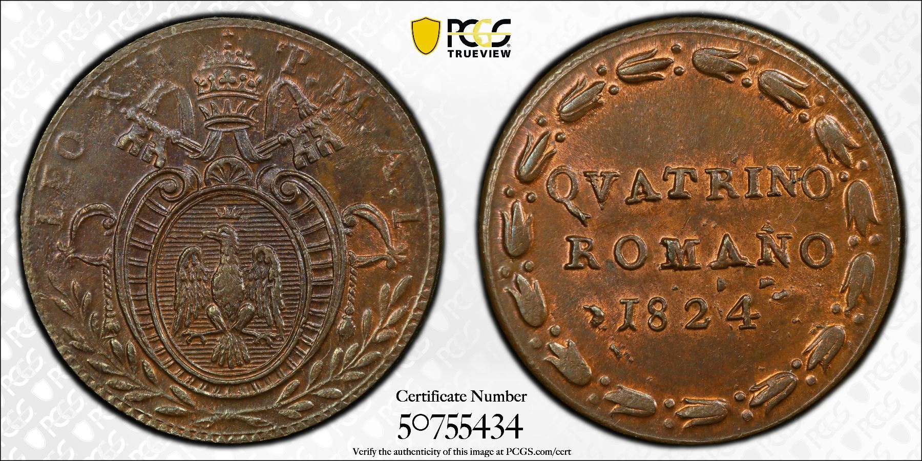 PAPAL STATES: Leo XII, 1823-1829, AE quattrino, Rome, 1824 year I, PCGS MS64 BN