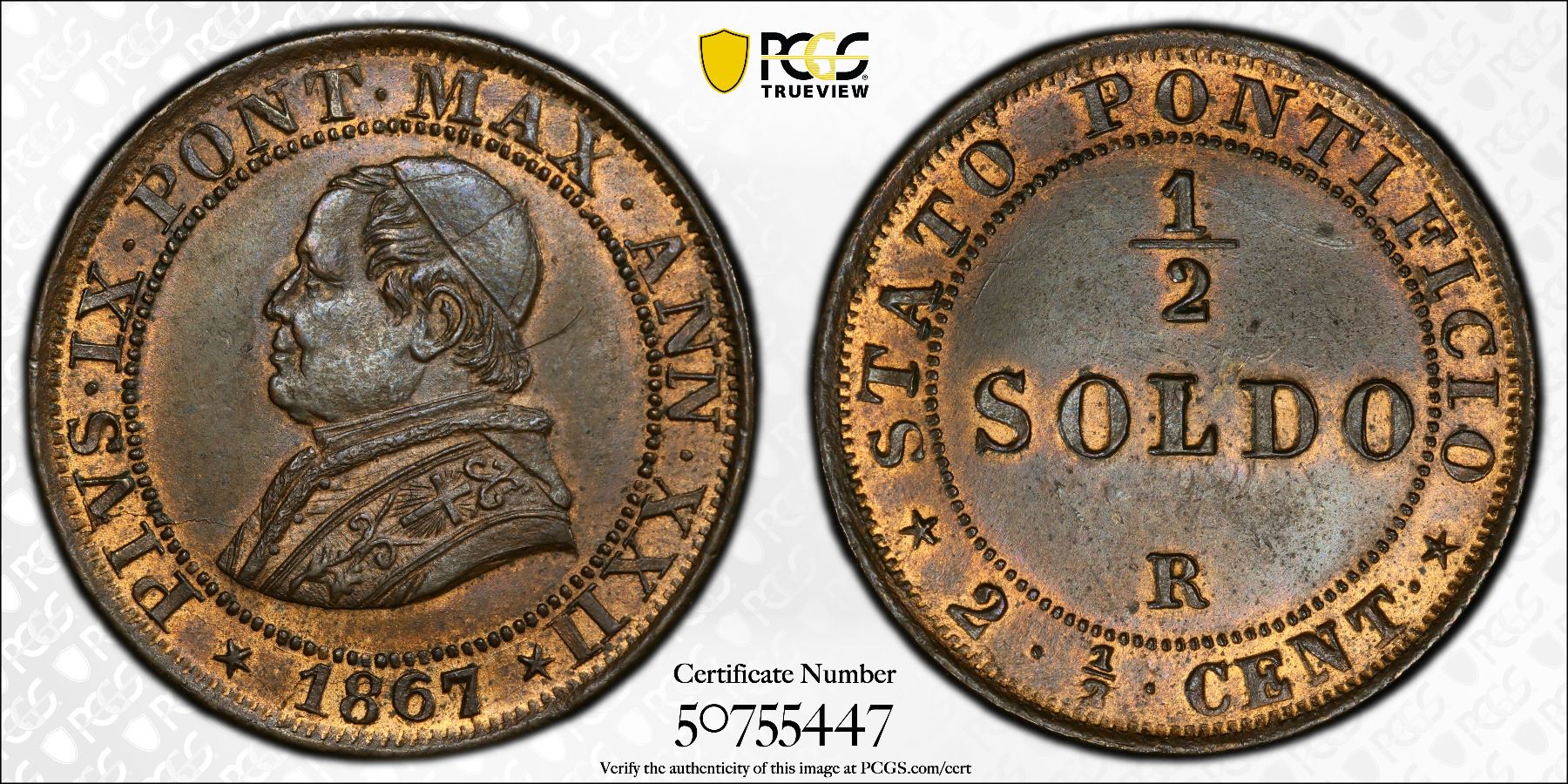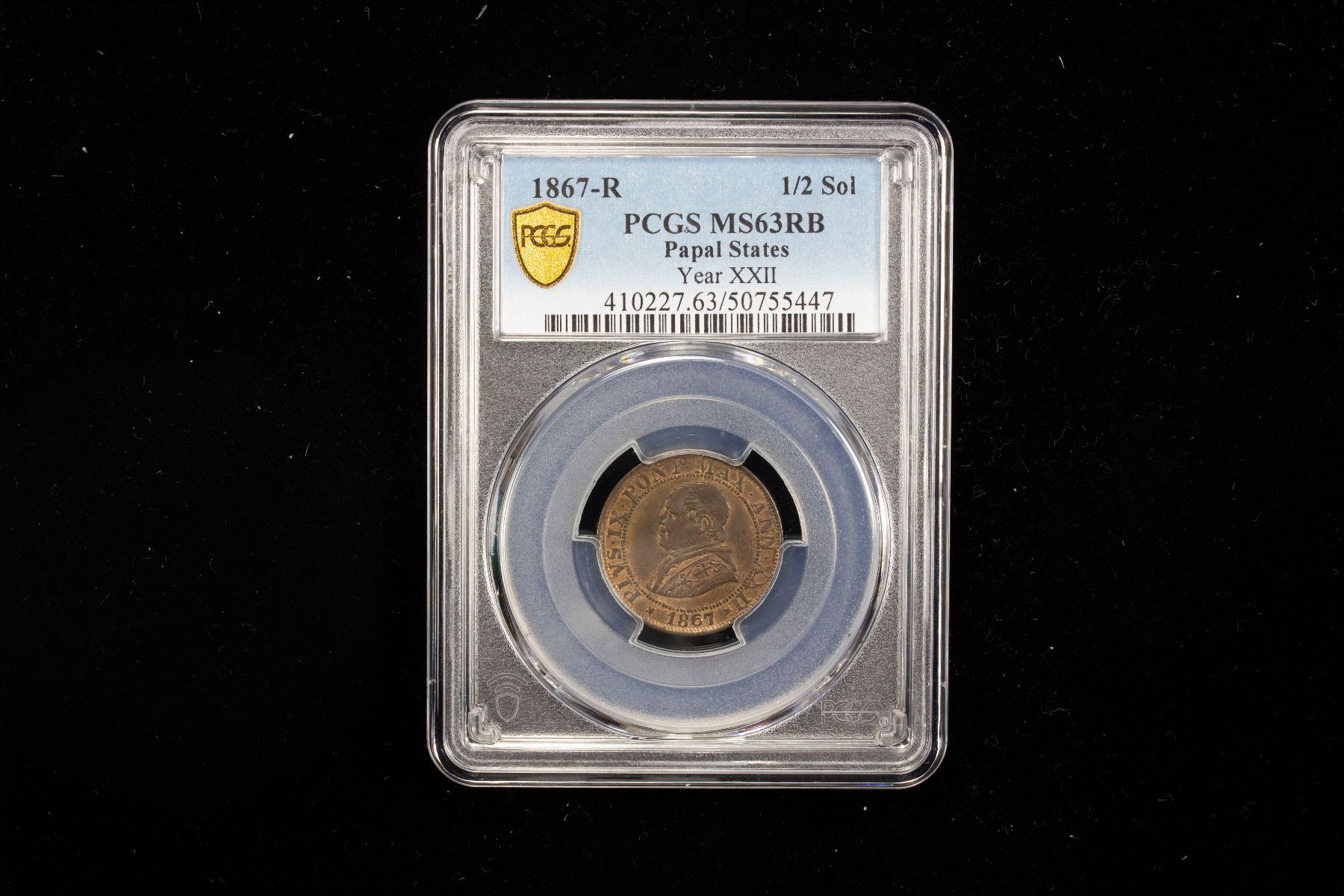 PAPAL STATES: Pius IX, 1846-1878, AE 1/2 soldo, 1867-R year XXII, KM-1371, a lovely lustrous caramel red brown mint state example! PCGS graded MS63 RB.