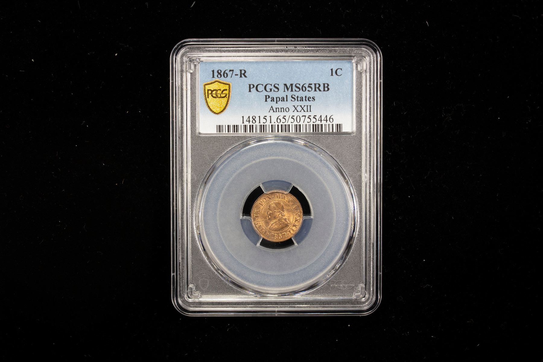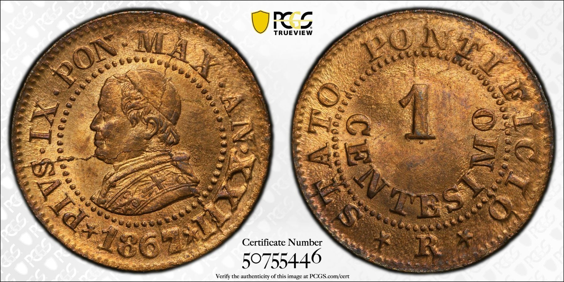PAPAL STATES: Pius IX, 1846-1878, AE centesimo, 1867-R year XXII, PCGS MS65 RB