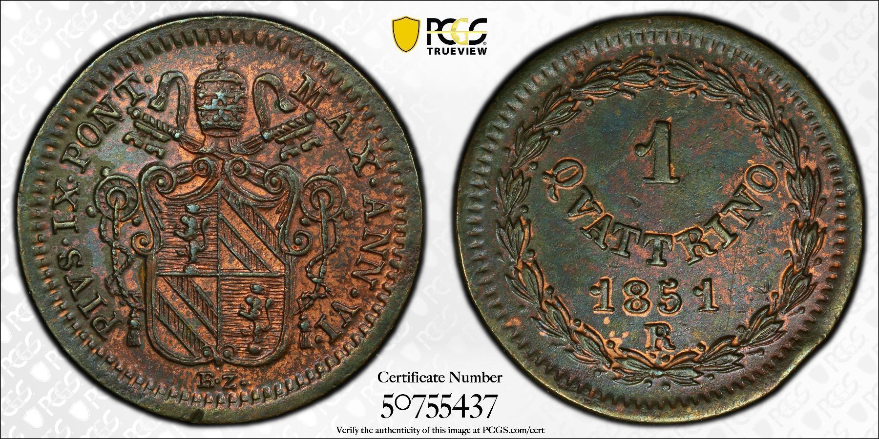PAPAL STATES: Pius IX, 1846-1878, AE quattrino, 1851-R year VI, PCGS MS62 BN