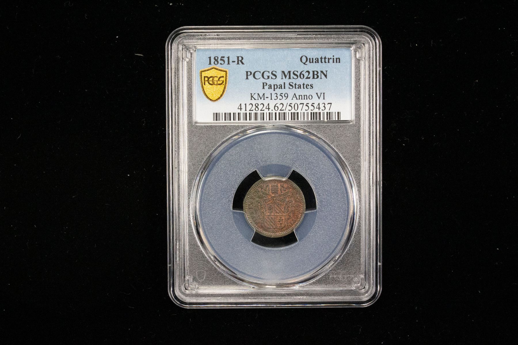 PAPAL STATES: Pius IX, 1846-1878, AE quattrino, 1851-R year VI, KM-1359, a pleasing lustrous chocolate brown mint state example, PCGS graded MS62 BN.