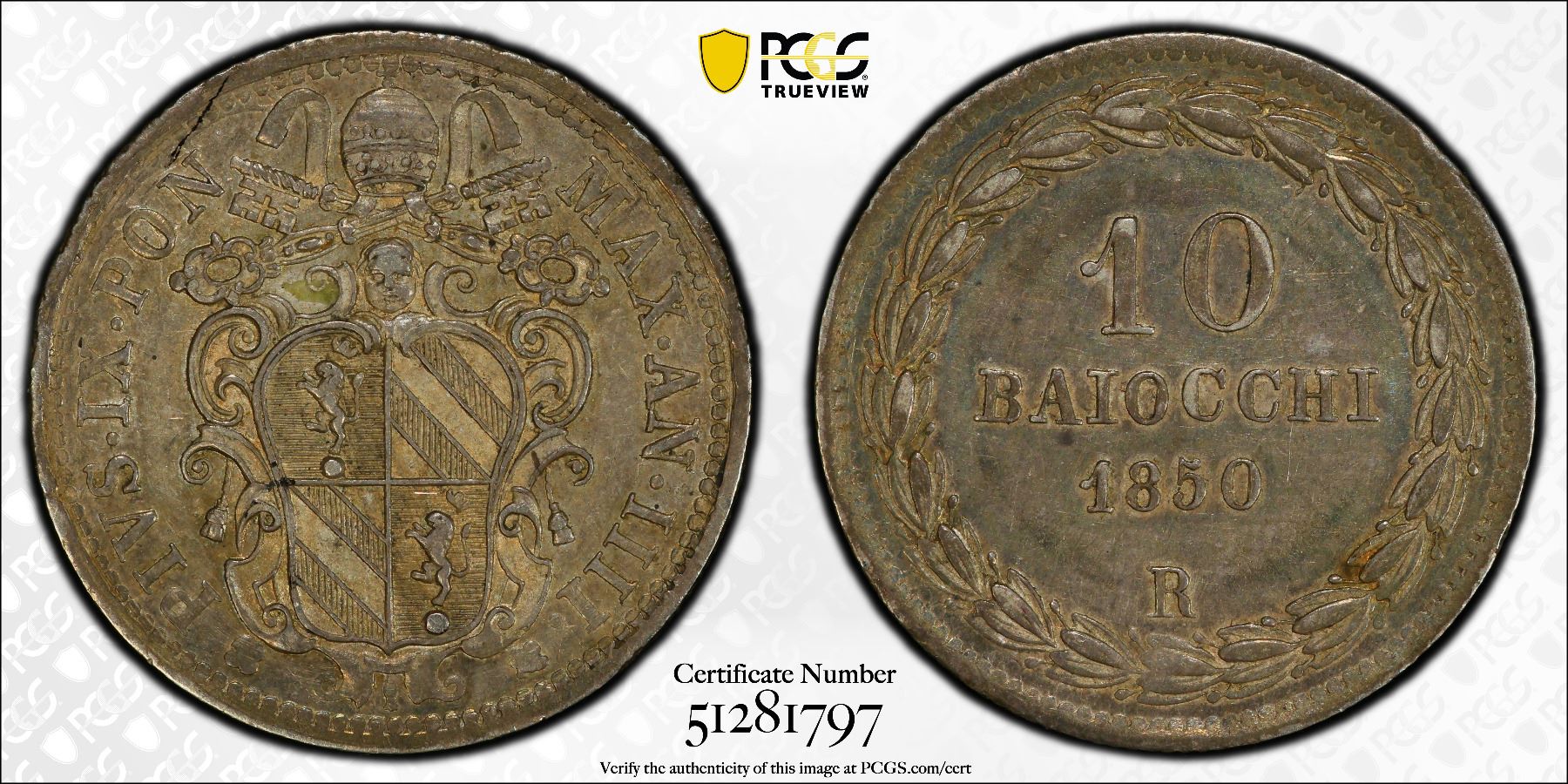 PAPAL STATES: Pius IX, 1846-1878, AR 10 baiocchi, 1850-R year IIII, PCGS AU58