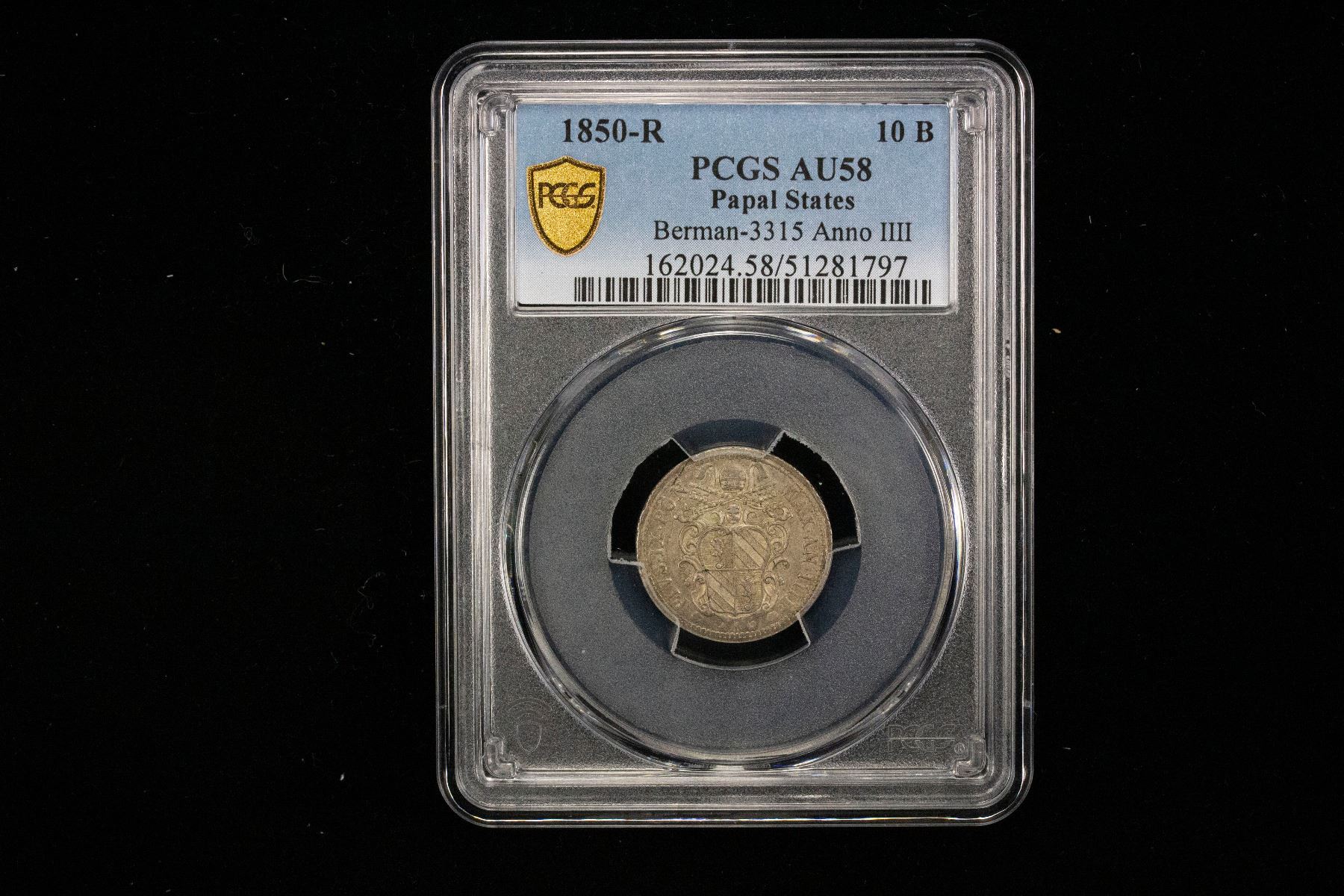 PAPAL STATES: Pius IX, 1846-1878, AR 10 baiocchi, 1850-R year IIII, KM-1342a, Berman-3315, an attractive nearly mint state example, PCGS graded AU58.