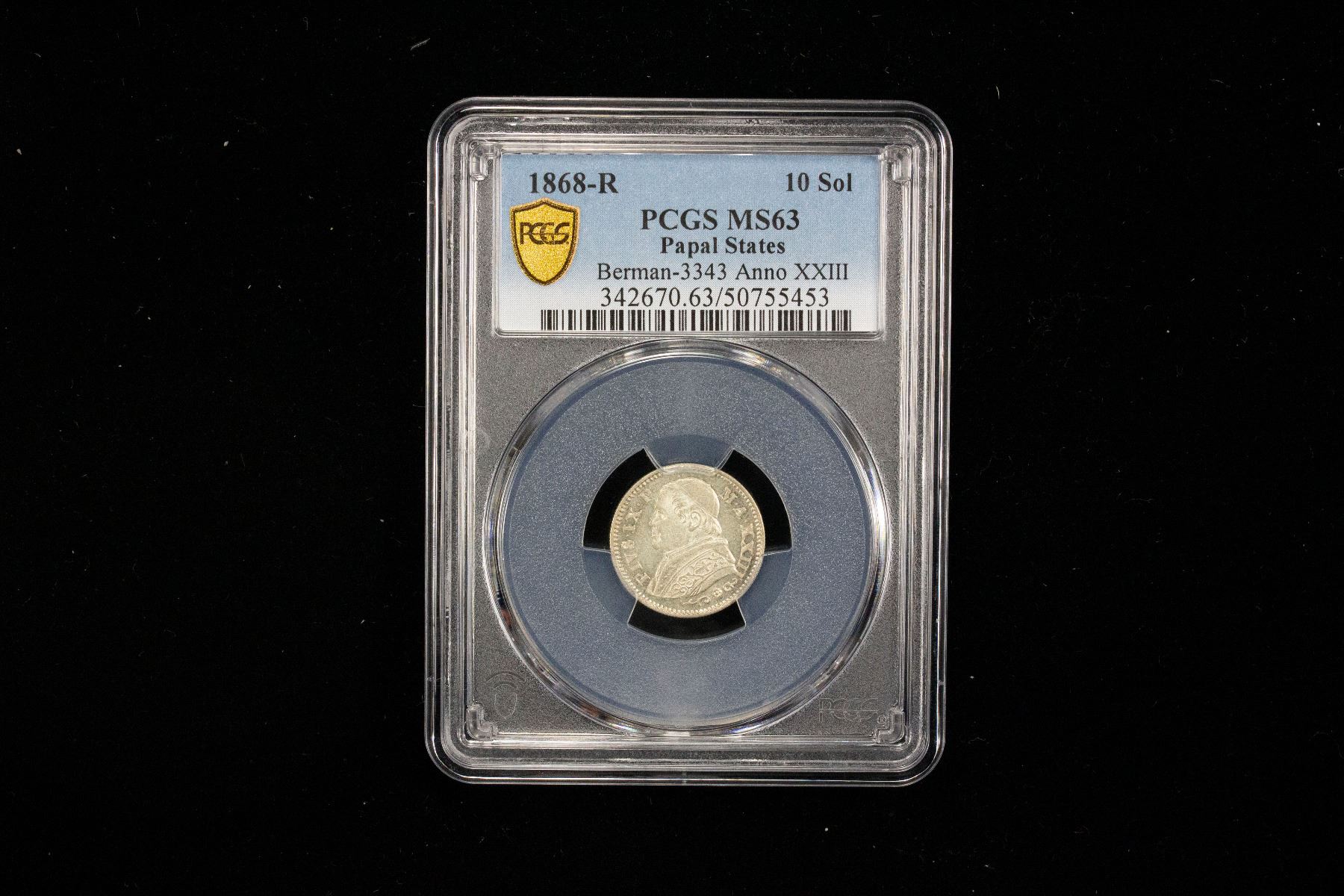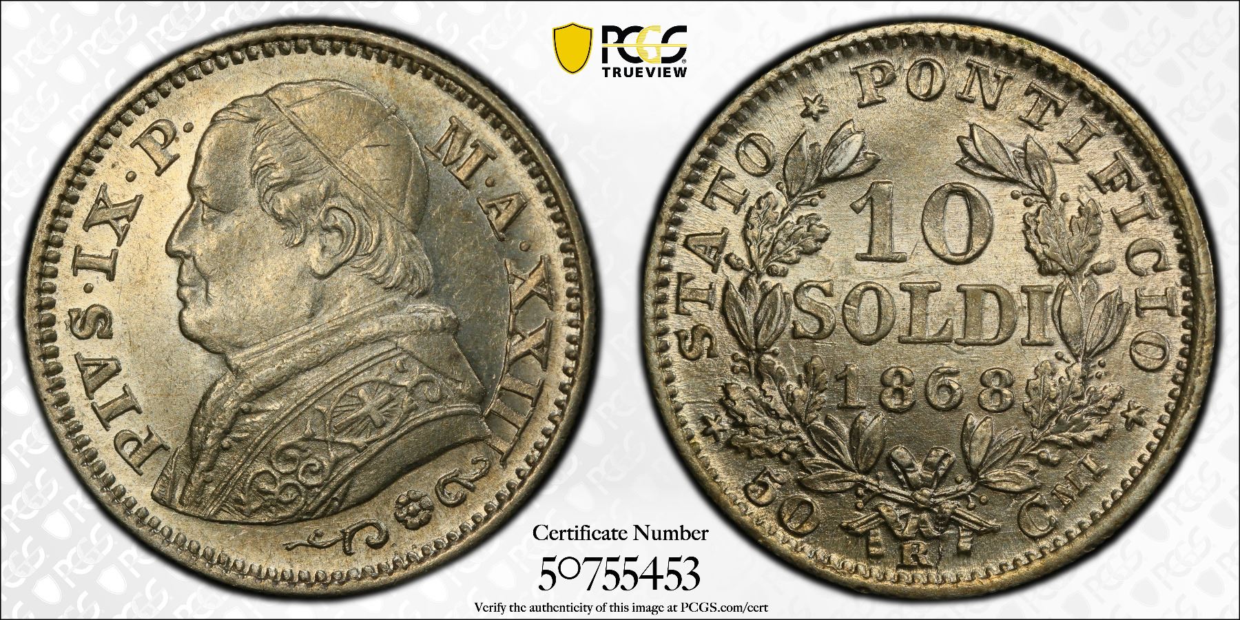PAPAL STATES: Pius IX, 1846-1878, AR 10 soldi / 50 centesimi, 1868-R year XXIII, PCGS MS63