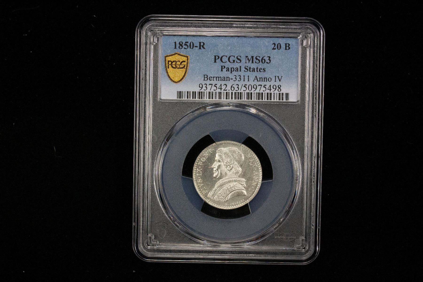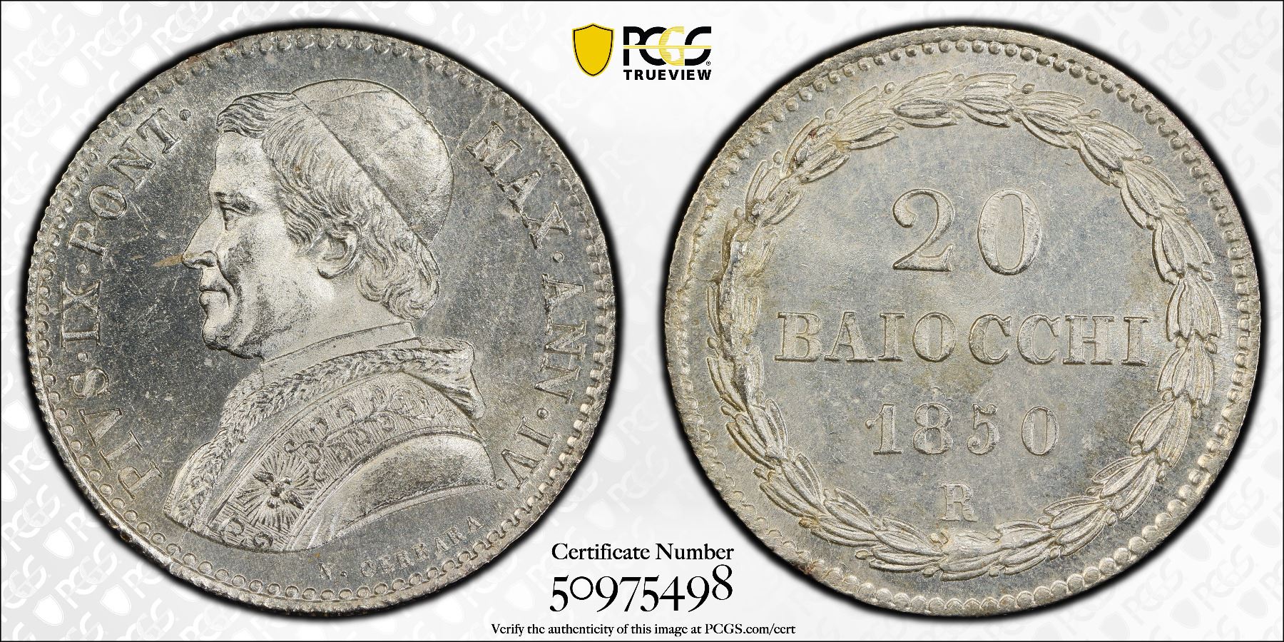 PAPAL STATES: Pius IX, 1846-1878, AR 20 baiocchi, 1850-R year IV, PCGS MS63