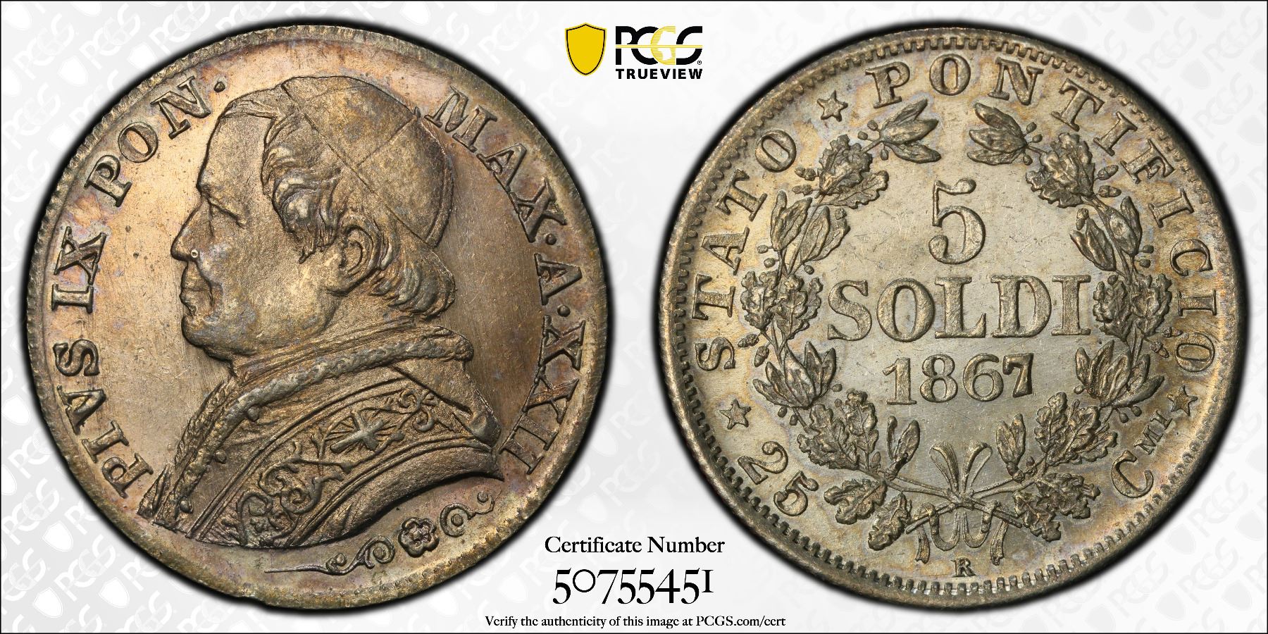 PAPAL STATES: Pius IX, 1846-1878, AR 5 soldi / 25 centesimi, 1867-R year XXII, PCGS MS62