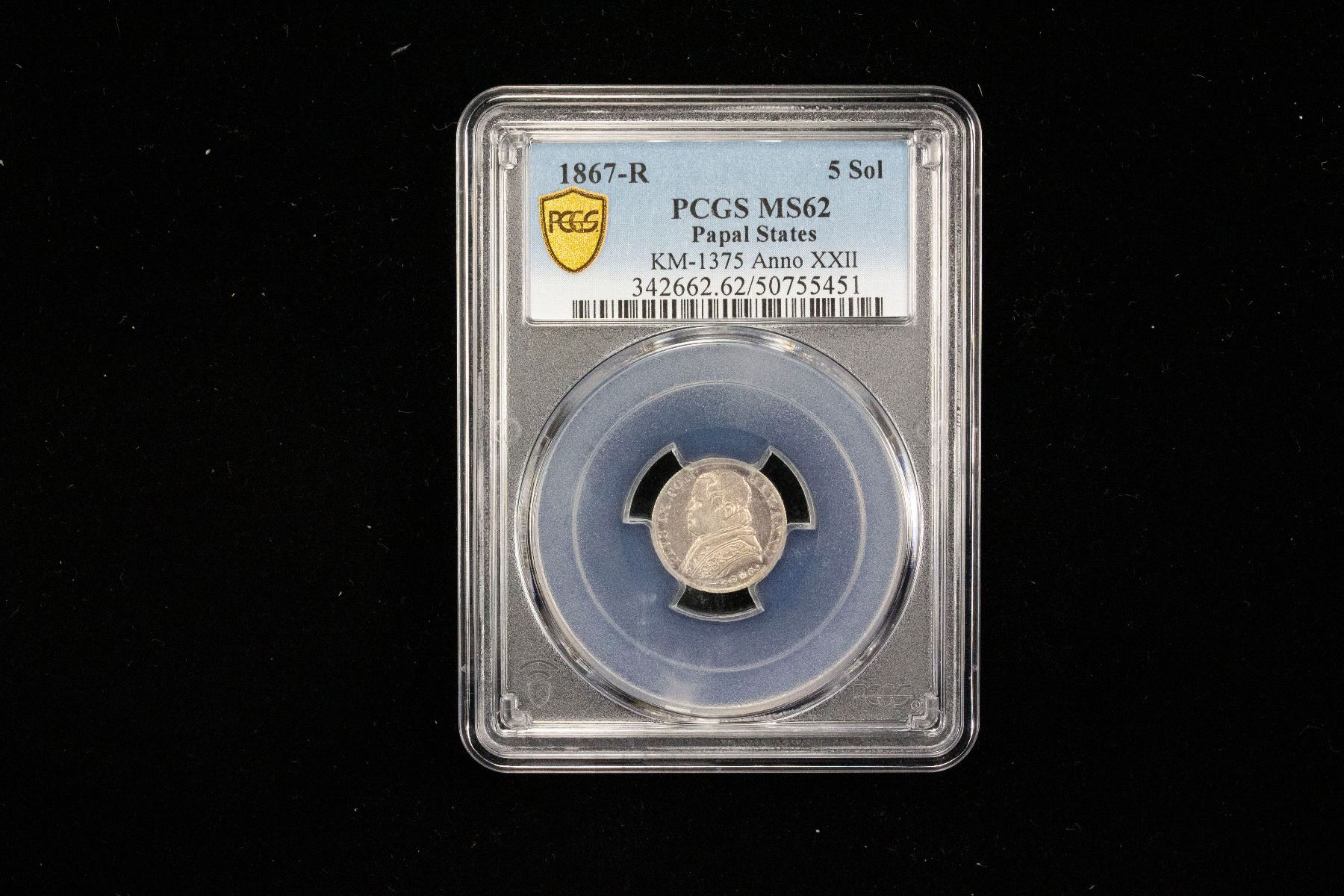 PAPAL STATES: Pius IX, 1846-1878, AR 5 soldi / 25 centesimi, 1867-R year XXII, KM-1375, a pleasing lustrous mint state example, PCGS graded MS62.