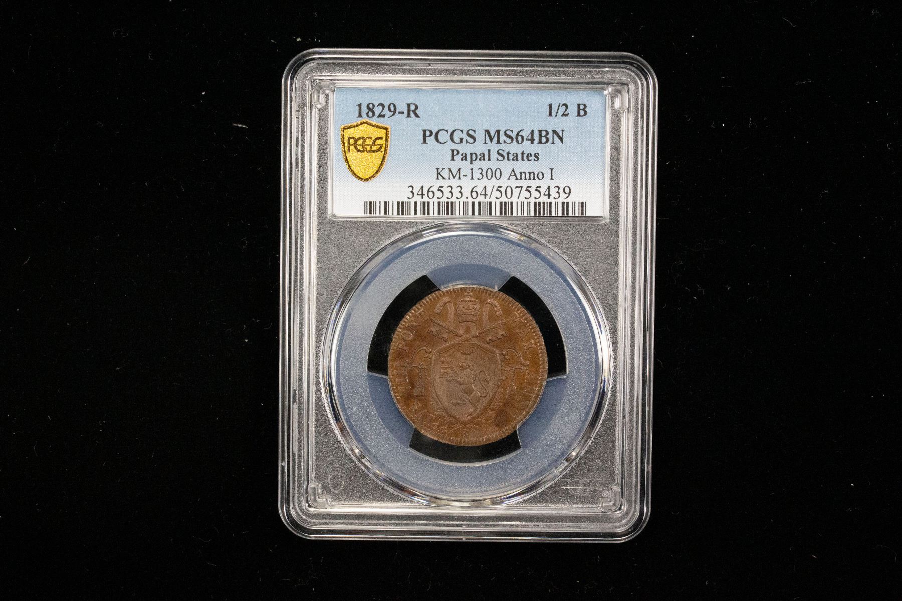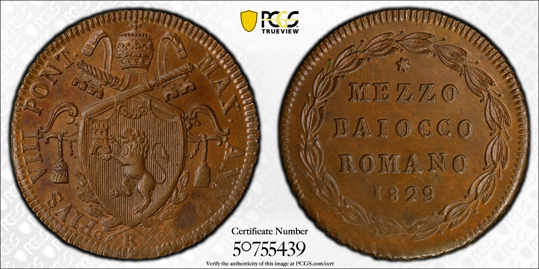 PAPAL STATES: Pius VIII, 1829-1830, AE 1/2 baiocco, 1829-R year I, PCGS MS64 BN