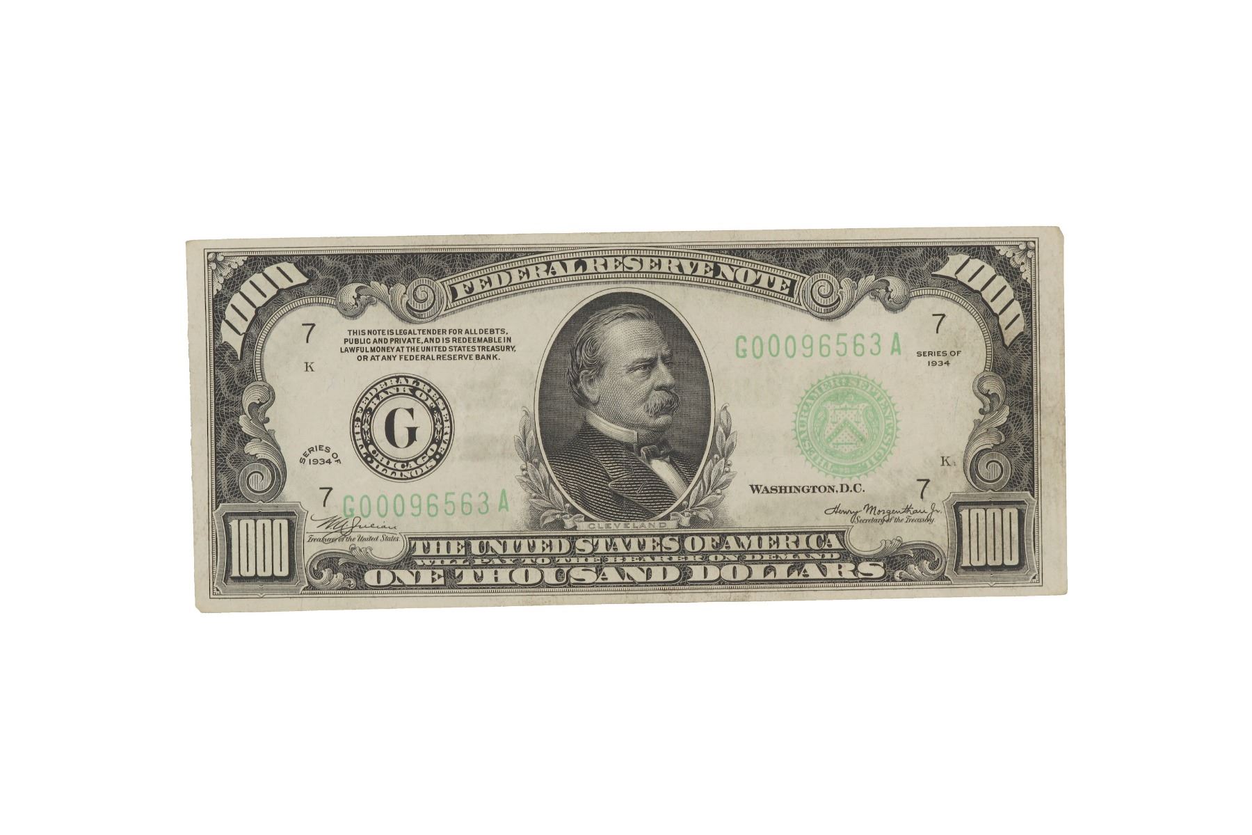 PAPER CURRENCY: 1934 U.S. $1000 bill; Serial Number G00096563A.