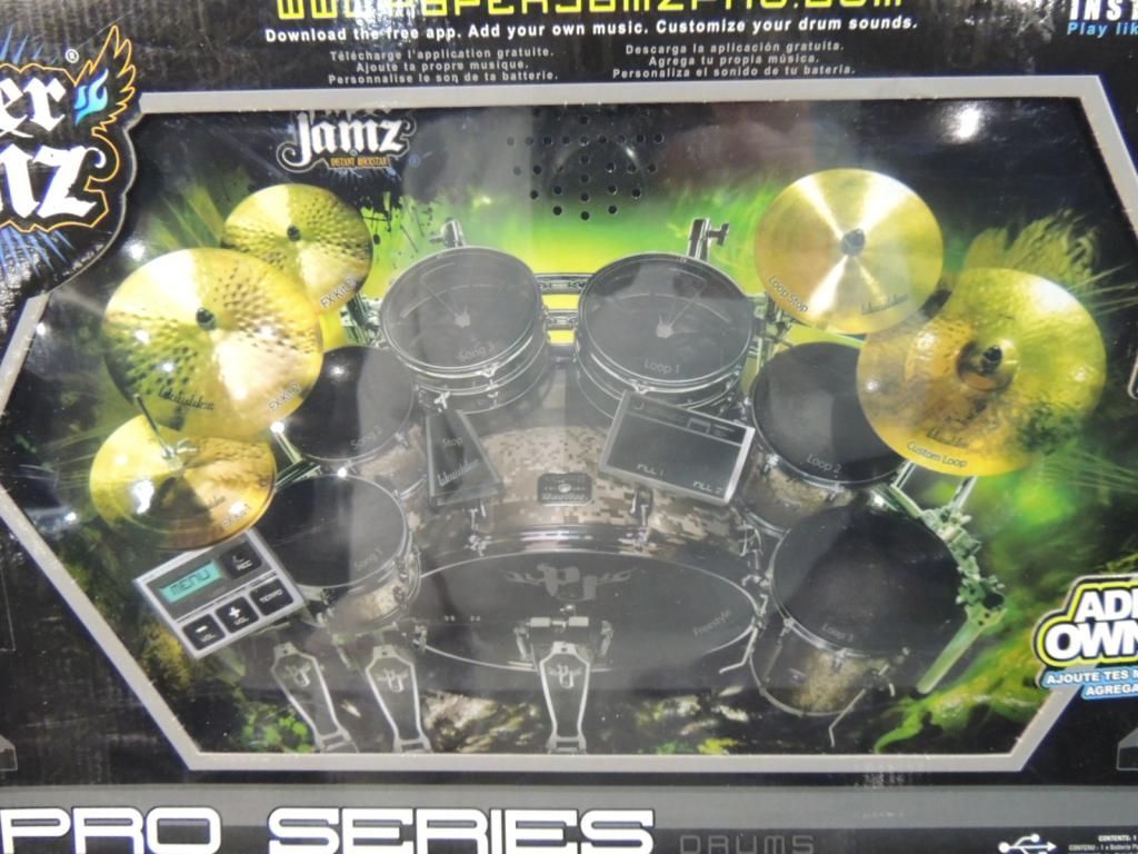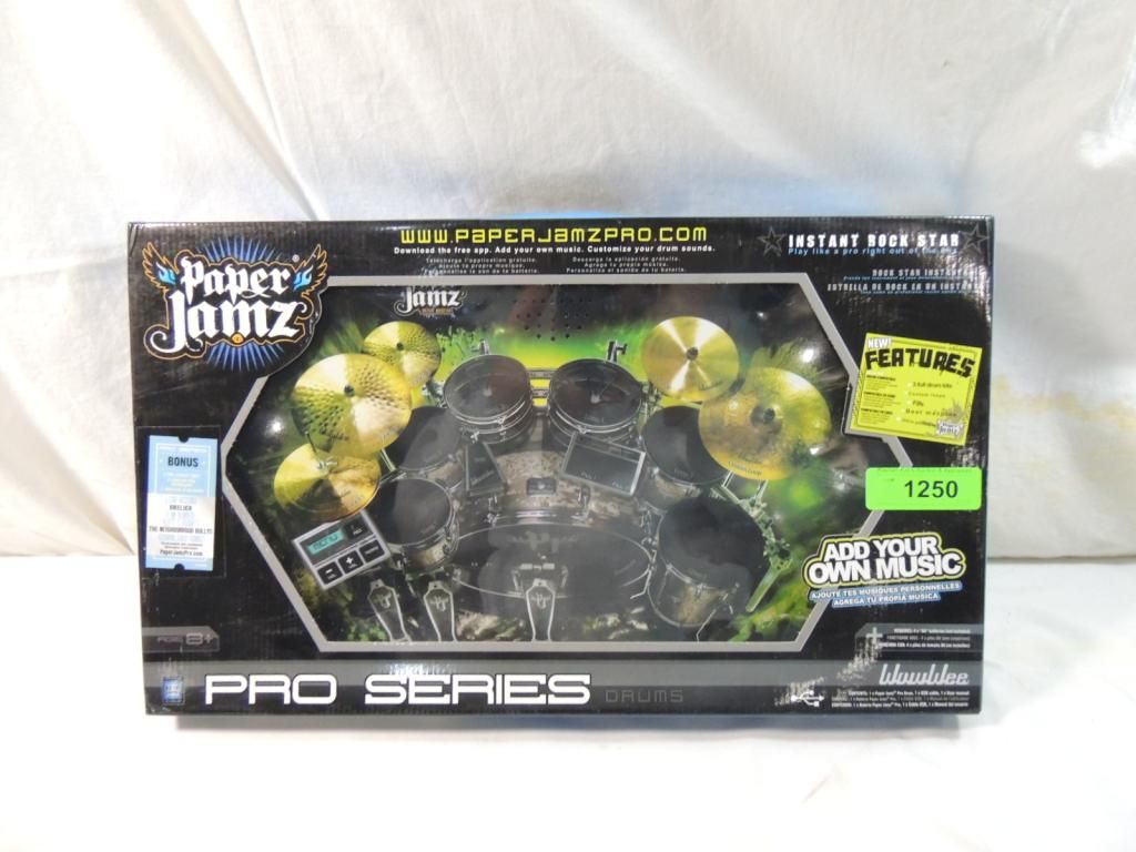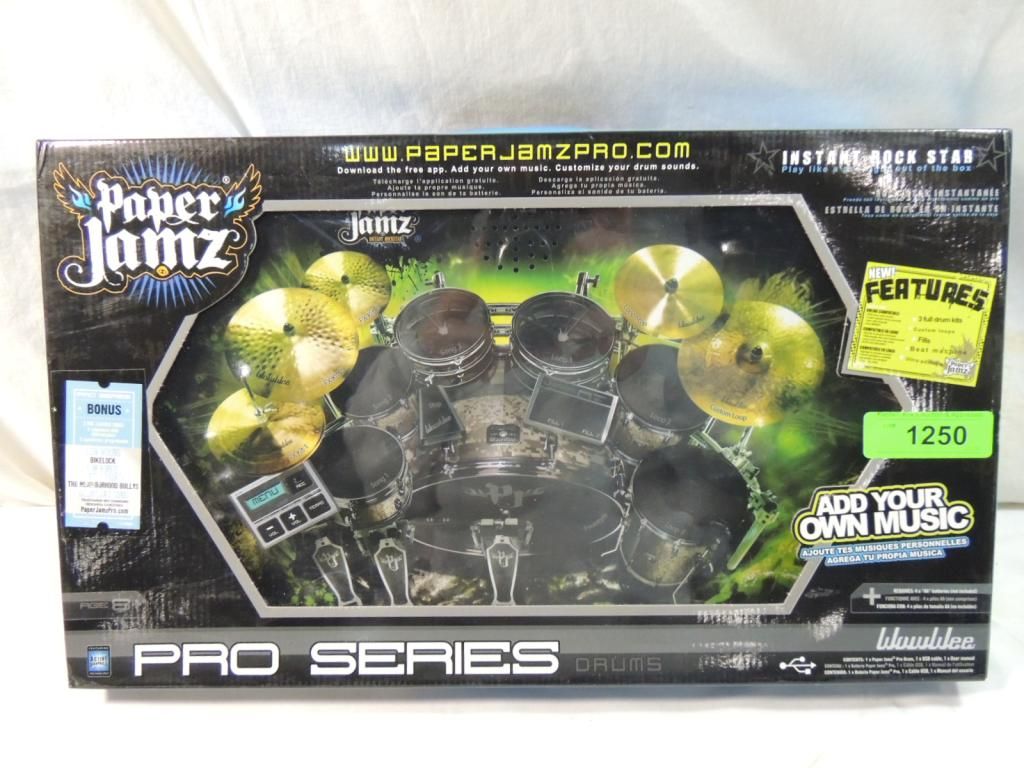 PAPER JAMZ PRO SERIES DRUMS INSTANT ROCK STAR, PLAY LIKE A PRO RIGHT OUT OF THE BOX, 3 FULL DRUM KITS CUSTOM LOOPS FILLS BEAT MACHINE ULTRA PORTABLE ONLINE CAMPATIBLE, ADD YOUR OWN MUSIC. REQUIRES 4 DOUBLE A BATTERIES ROCK OUT LIKE NEVER BEFORE. AS SHOWN