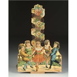 PAPER LITHOGRAPHED MARBLE GAME WITH CHILDREN. Turn of the Century and of unknown manufacturer (possibly Continental), five children are playing ring-around-the-rosy while the pole entwined in the vine secures the spring where the marble twirls about and exits at the bottom. SIZE: 15”. CONDITION: Overall condition is excellent, slight bubbling to paper with minor paper loss on right side. Base is lacking. JL 1-4293 (200-300)