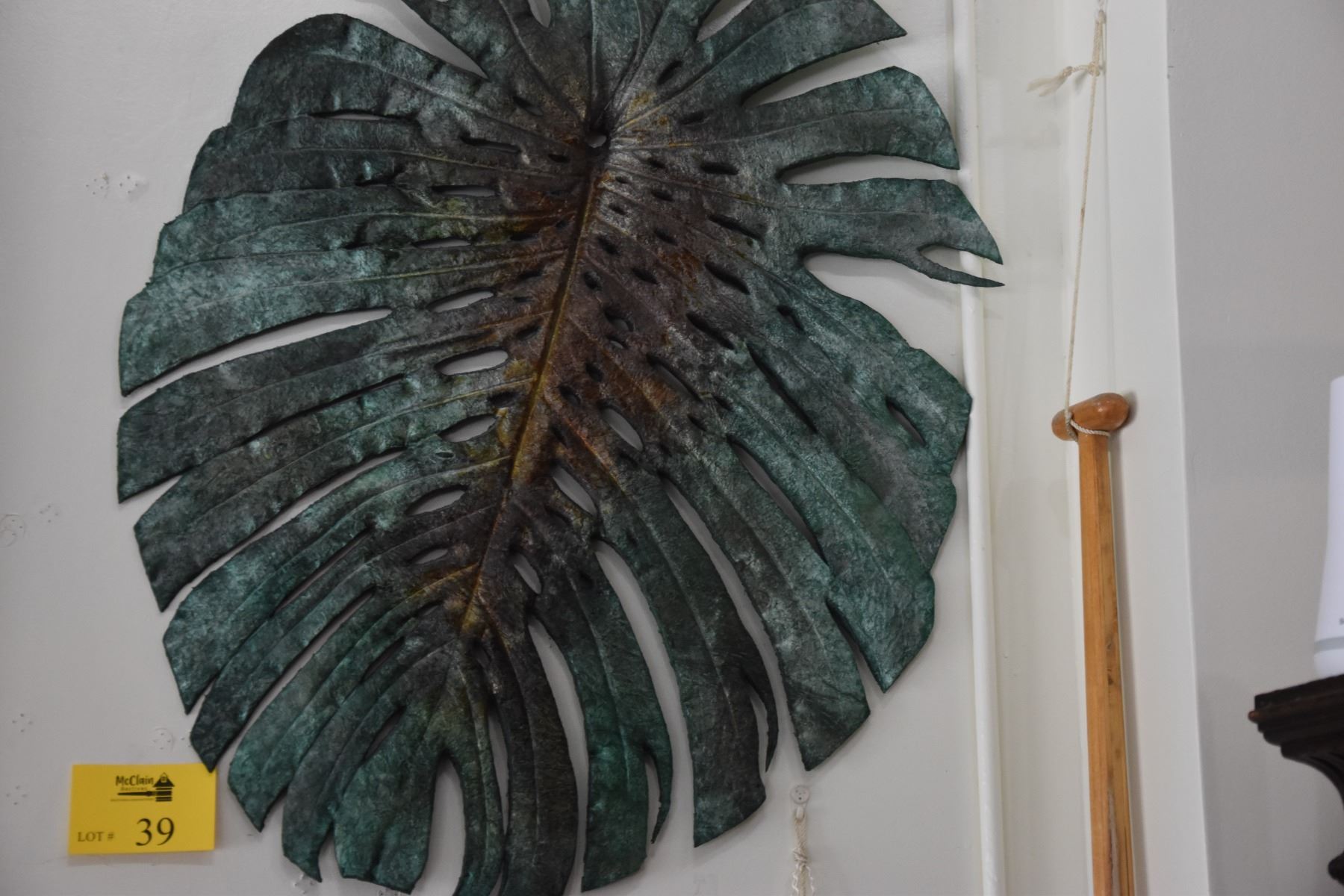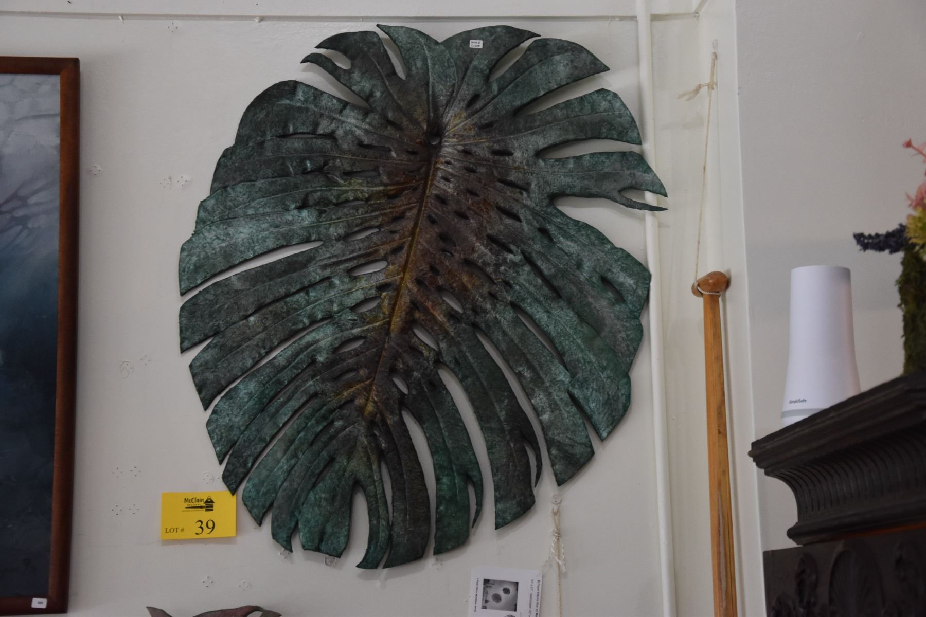 PAPER MACHE FIBER ART MONSTERA LEAF, TEAL/COPPER COLOR BY ARTIST TERRY TAUBE, KONA, HI (32" X 27")