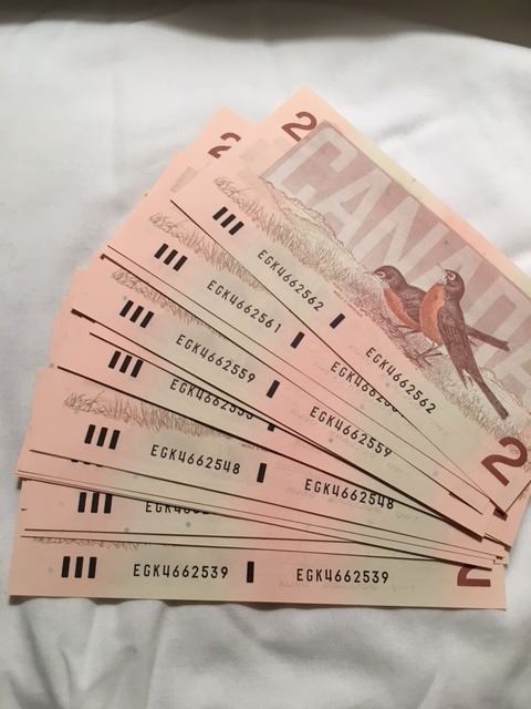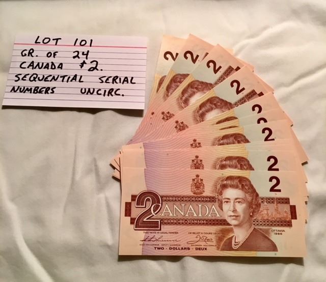 CANADIAN, GR OF 24, 2 DOLLAR BILLS, SEQUENTIAL SERIAL NUMBERS, UNCIRCULATED