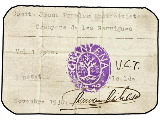 PAPER MONEY OF THE CIVIL WAR - 1 Peseta. Noviembre 1936. COMITÉ FRONT POPULAR ANTIFEIXISTA. GRANYENA DE LES GARRIGUES. Firma del alcalde Ramón Ribas. MUY RARO. AT-1178d. (MBC+).