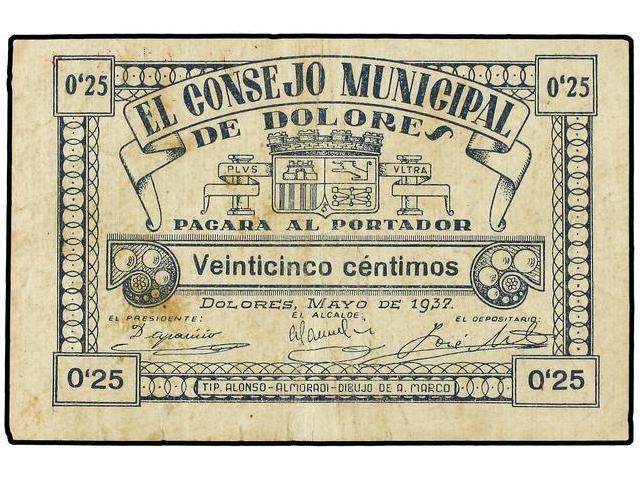 PAPER MONEY OF THE CIVIL WAR: ALICANTE - 0,25 Pesetas. Año 1937. C.M. de DOLORES (Alicante). MUY ESCASO. Mont-592D. MBC.