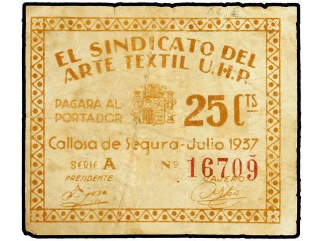 PAPER MONEY OF THE CIVIL WAR: ALICANTE - 25 Cèntims. Juliol 1937. EL SINDICATO DEL ARTE TÉXTIL U.H.P. CALLOSA DE SEGURA (Alicante). (Pequeñas roturas. Sucio). TV-470. MBC.
