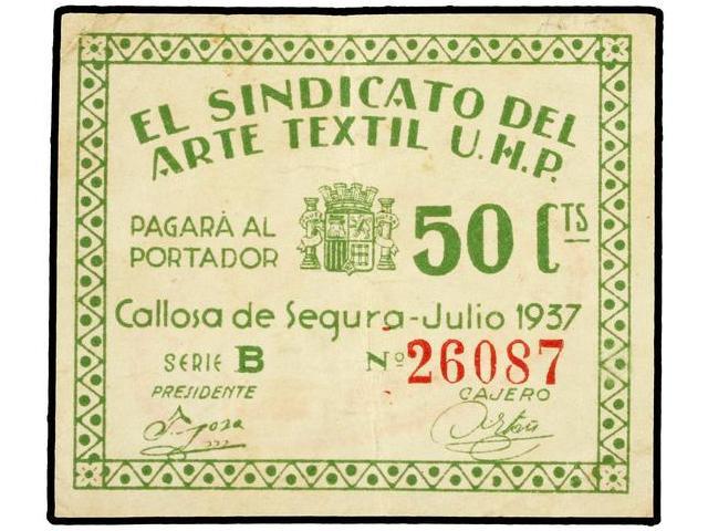 PAPER MONEY OF THE CIVIL WAR: ALICANTE - 50 Cèntims. Julio 1937. EL SINDICATO DEL ARTE TÉXTIL U.H.P. CALLOSA DE SEGURA (Alicante). (Algo sucio). TV-469. EBC-.