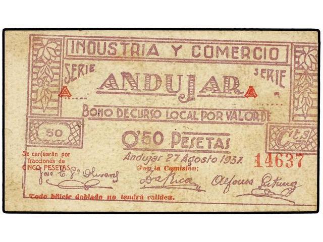 PAPER MONEY OF THE CIVIL WAR: ANDALUCÍA - 0,50 Pesetas. 27 Agosto 1937. INDUSTRIA Y COMERCIO ANDUJAR (Jaén). Cartón. (Algo sucio). Mont-168c. MBC+.