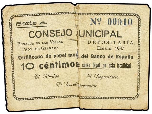 PAPER MONEY OF THE CIVIL WAR: ANDALUCÍA - 10 Céntimos. Emisión 1937. C.M. de BENALUA DE LAS VILLAS (Granada). (Rotura central cosida). MUY RARO. Mont-277a. BC.