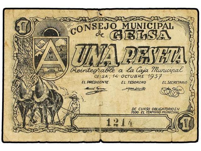 PAPER MONEY OF THE CIVIL WAR: ARAGÓN-FRANJA DE PONENT - 1 Peseta. 14 Octubre 1937. C.M. de GELSA (Zaragoza). (Pequeñas roturas y leves manchitas). (MBC+).