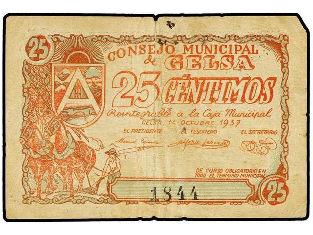 PAPER MONEY OF THE CIVIL WAR: ARAGÓN-FRANJA DE PONENT - 25 Céntimos. 14 Octubre 1937. C.M. de GELSA (Zaragoza). (Pequeñas roturas y pequeña manchita). (MBC).