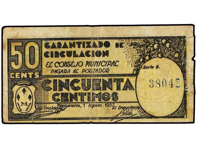 PAPER MONEY OF THE CIVIL WAR: CASTILLA-LA MANCHA - 50 Céntimos. 1 Agosto 1937. C.M. de MANZANARES (Ciudad Real). (Pequeñas roturas). Mont-881B. MBC.