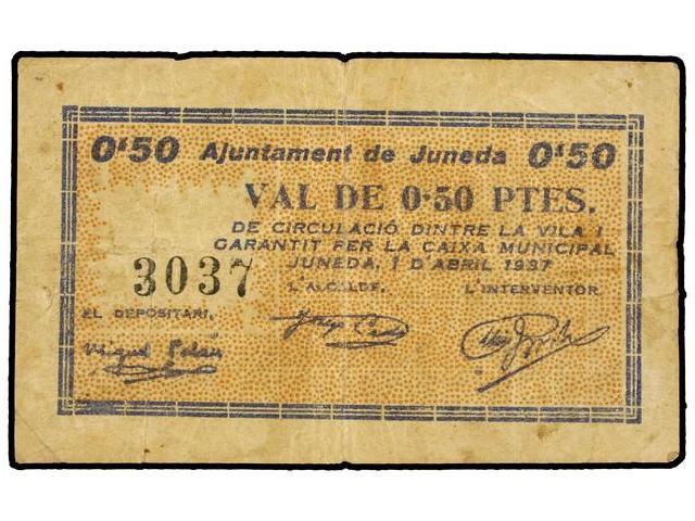 PAPER MONEY OF THE CIVIL WAR: CATALUNYA - 0,50 Pessetes. 1 Abril 1937. Aj. de JUNEDA. MUY ESCASO. AT-1292; T-1479. MBC-.