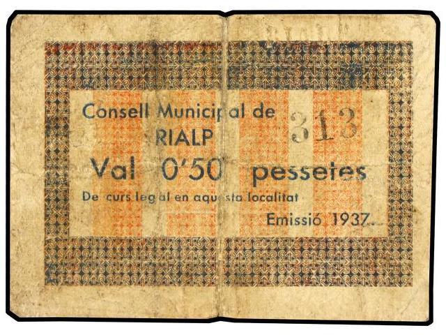 PAPER MONEY OF THE CIVIL WAR: CATALUNYA - 0,50 Pessetes. Emissió 1937. C.M. de RIALP. (Sucio, roturas reparadas con cinta adhesiva). MUY ESCASO. AT-2092a; T-2417a. BC+/MBC-.