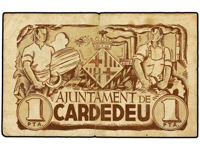 PAPER MONEY OF THE CIVIL WAR: CATALUNYA - 1 Pesseta. 1 Juny 1937. Aj. de CARDEDEU. (Pequeñas roturas. Algo sucio). AT-667; T-780. MBC.
