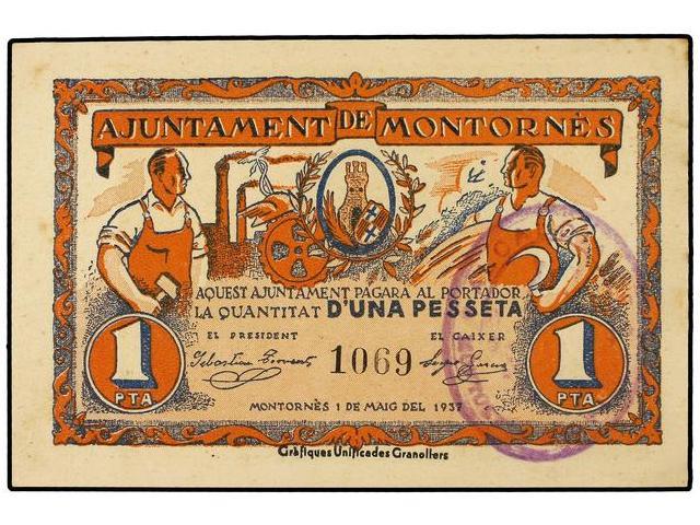 PAPER MONEY OF THE CIVIL WAR: CATALUNYA - 1 Pesseta. 1 Maig 1937. Aj. de MONTORNÈS DEL VALLÈS. (Leves manchitas). MUY ESCASO. AT-1591a; T-1827a. SC-.
